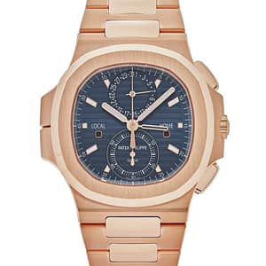 Papers and the manufacturer’s box accompany this unworn Patek Philippe Nautilus Travel Time Chronograph 18K Rose Gold Watch 5990/1R-001.