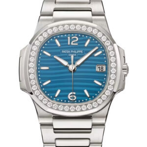 The watch features an azure-blue lacquered dial with the signature Nautilus “wave” pattern, complemented by white-gold applied Arabic numerals and ogival hour markers filled with luminescent coating for optimal readability. The dial includes a date window at 3 o’clock and central sweep seconds.