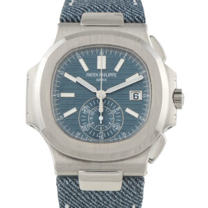 The Patek Philippe Nautilus 18K White Gold Watch, reference number 5980/60G-001, is a sporty timepiece that offers precision timekeeping with a touch of color.