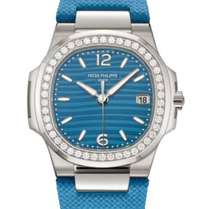 The dial showcases a lacquered azure-blue finish with the classic Nautilus “wave” motif, enhanced by white gold applied Arabic numerals and ogival hour markers filled with white luminescent coating for readability. White gold alpha-style hands, also treated with luminescent coating, glide over the dial — alongside a date aperture at 3 o’clock and a central seconds hand.