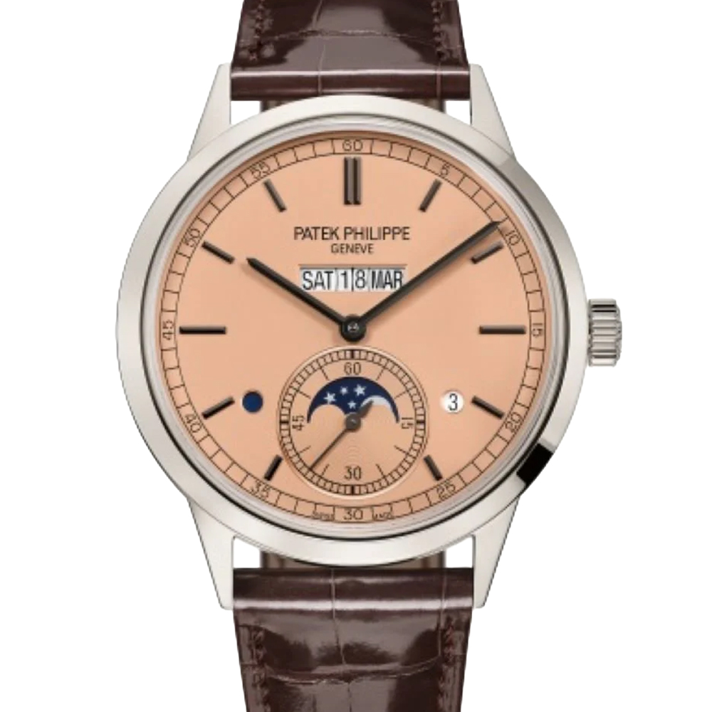 The 5270P-001 reframes the Grand Complication through tone alone, its salmon dial introducing warmth to a platinum case and elevating an already formidable calendar chronograph. Twin apertures present day and month, with a moonphase and date at six, all arranged within a balanced perpetual calendar chronograph display. Arabic numerals mark the upper half, while faceted hour markers are in the lower half. Blackened gold leaf-shaped hands sharpen legibility across the complex layout.