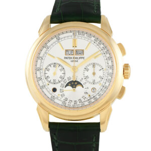 A distinguished timepiece. The Patek Philippe Grand Complications Perpetual Calendar Chronograph Ref. 5270J-001 is a testament to the Swiss luxury watchmaker’s commitment to horological excellence. This model seamlessly integrates a perpetual calendar and chronograph in a 41mm yellow gold case, worn on a leather strap. It features an easy-to-read silvery opaline dial with yellow gold hands and hour markers, a tachymeter scale, day and month indicators, moon phase with date display, day/night indicator, and chronograph sub-dials.