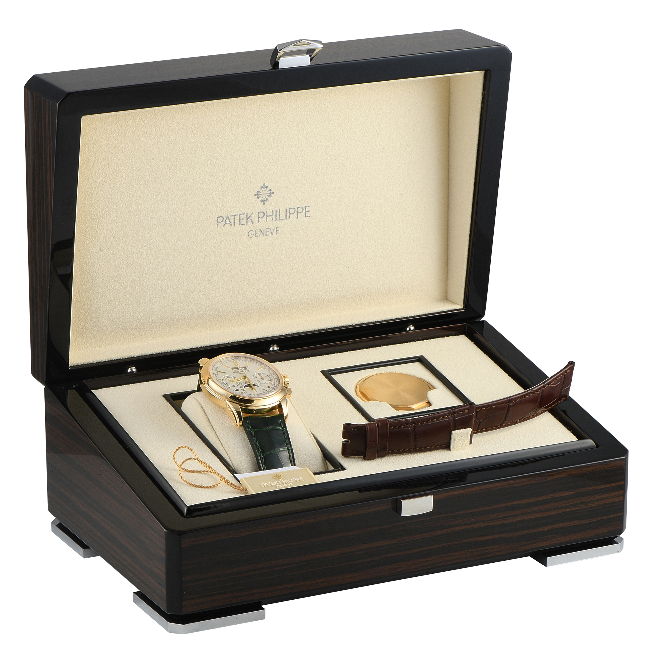 This pre-owned Patek Philippe Perpetual Calendar Chronograph Watch 5270J-001 comes with papers, an extra strap, a medallion, and the manufacturer’s box.