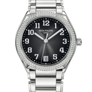 Embodying feminine elegance, this ladies’ watch from Patek Philippe is the first model in the Twenty~4 Automatic Collection to feature a round case. The 36mm steel case is framed by a diamond-set bezel that blends harmoniously with the gray sunburst dial. On the dial are round-tipped baton hands and highly legible Arabic numerals treated with Super-LumiNova. Designed for everyday wear, the watch is fitted with a graceful articulated bracelet. Powering this watch is the in-house caliber 324 SC automatic movement composed of 213 parts, with a power reserve of up to 45 hours.