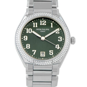 Refined proportions and a jewelry-like finish define the Twenty~4 Collection. This Patek Philippe ref. 7300/1200A-011 is an automatic time-and-date ladies’ watch crafted in stainless steel. Its 36mm round case is fitted with a hand-finished steel bracelet with a fold-over clasp. The diamond-set bezel, featuring over a hundred brilliant-cut diamonds, provides a frame of precision and opulence. On the olive-green sunburst dial are applied white gold Arabic numerals with luminous fill, lumed baton hands, and a date window at 6 o’clock. At its heart beats the 4Hz self-winding Caliber 26-330 S C, with 219 parts, 30 jewels, and approximately 45 hours of power reserve.