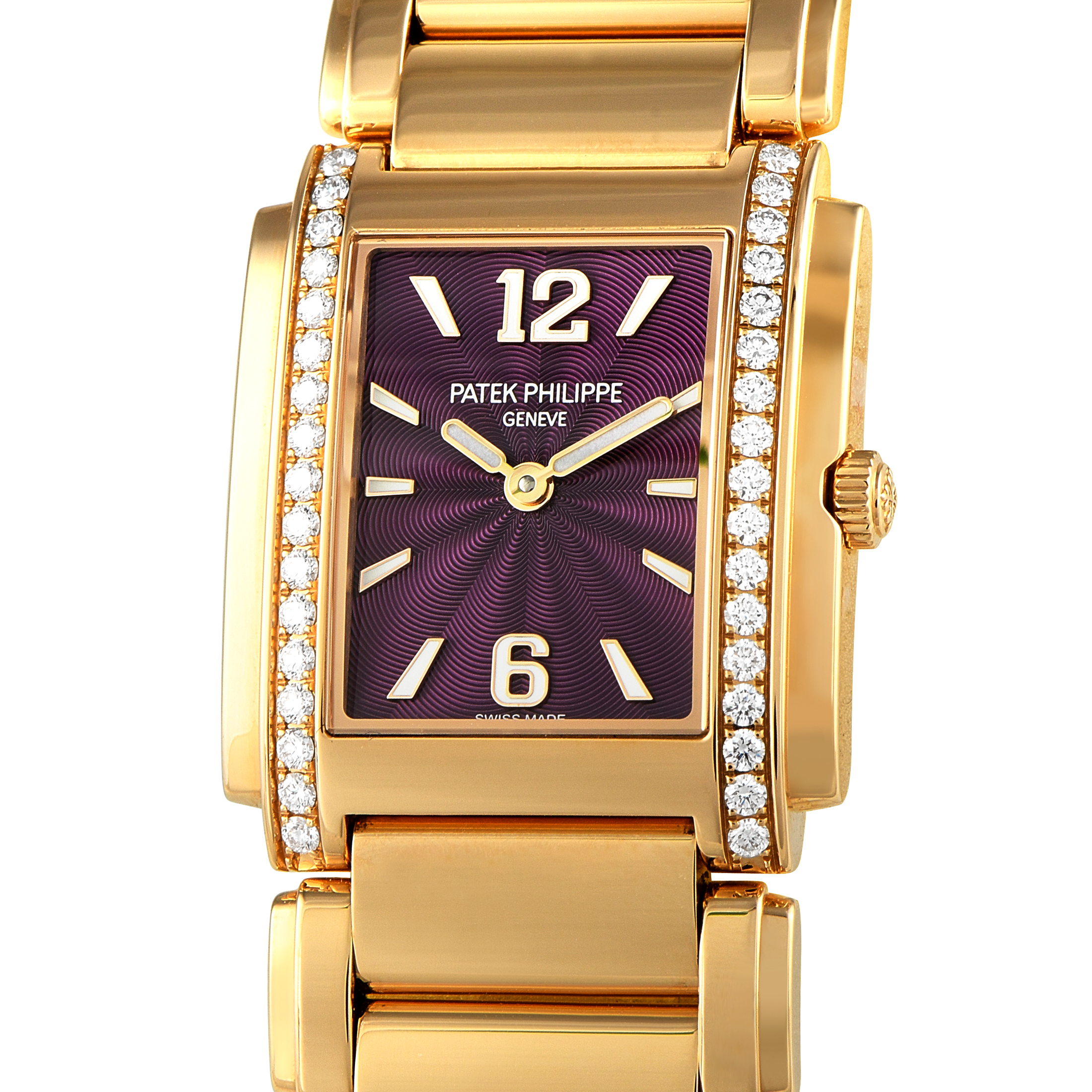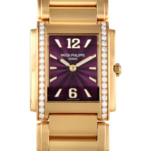 For the 25th anniversary of the Twenty~4 ladies’ collection, Patek Philippe ensured that it brought in some personality without compromising elegance. The Ref. 4910/1200A-001, crafted in 18K rose gold, features a rectangular case with two vertical rows of brilliant-cut diamonds framing the purple lacquered dial. The watch’s attractive face features an embossed concentric wave pattern, complemented by applied rose gold hour markers and numerals with a white luminescent coating. The case measures 25.1 x 30 mm and is fitted with a matching rose gold bracelet. The 6-jewel caliber E15 quartz movement is the beating heart of this watch.