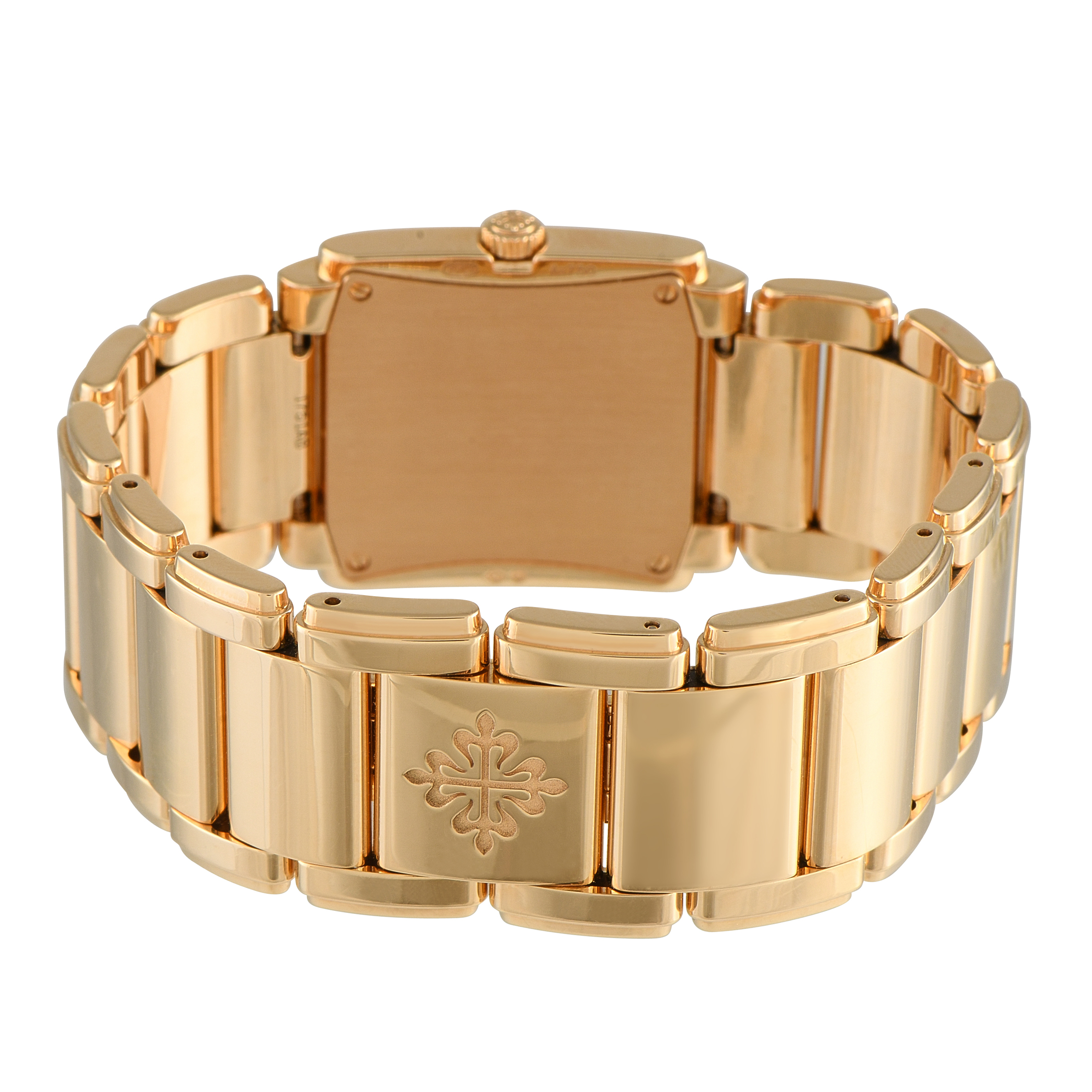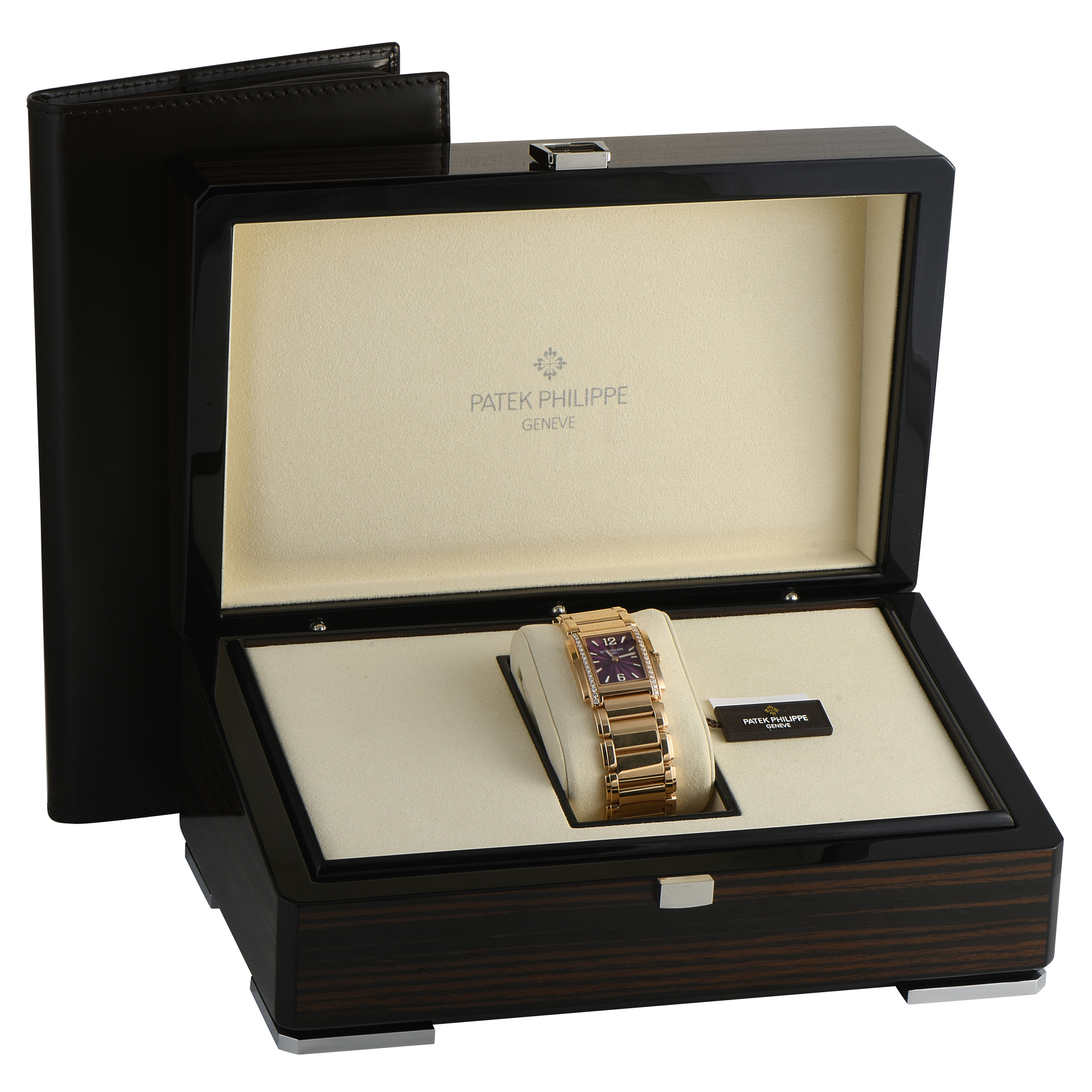 This is a pre-owned Patek Philippe Twenty~4 Diamond and 18K Rose Gold Quartz Ladies Watch 4910-1201R-010. It is accompanied by papers and the manufacturer’s box.