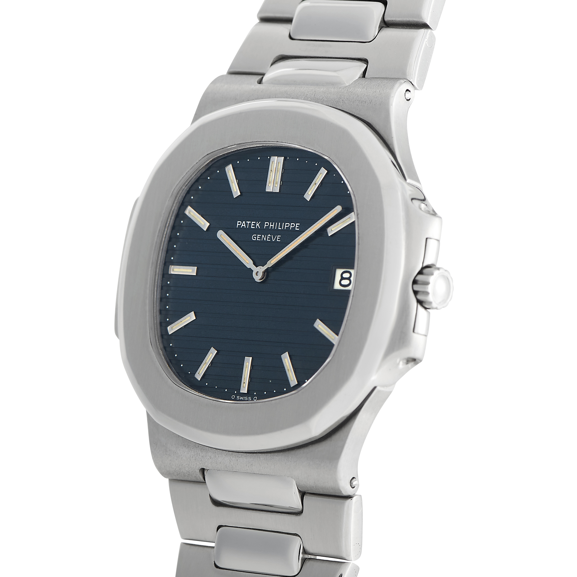 Simple and sleek yet daring and brilliant, the Nautilus Jumbo ref.3700/1A offers a one-of-a-kind wrist presence. This understated timepiece that wears like a dream was produced in 1978. It has a greyish-blue dial with sporty-elegant horizontal grooves and a neat layout. The tritium-filled white gold hour markers and hands, the discreet date window at 3, and the missing central seconds hand all work together to give the watch’s face an exquisite look. Inside this watch is the ultra-thin automatic caliber 28-255C built on Jaeger-LeCoultre 920 base.