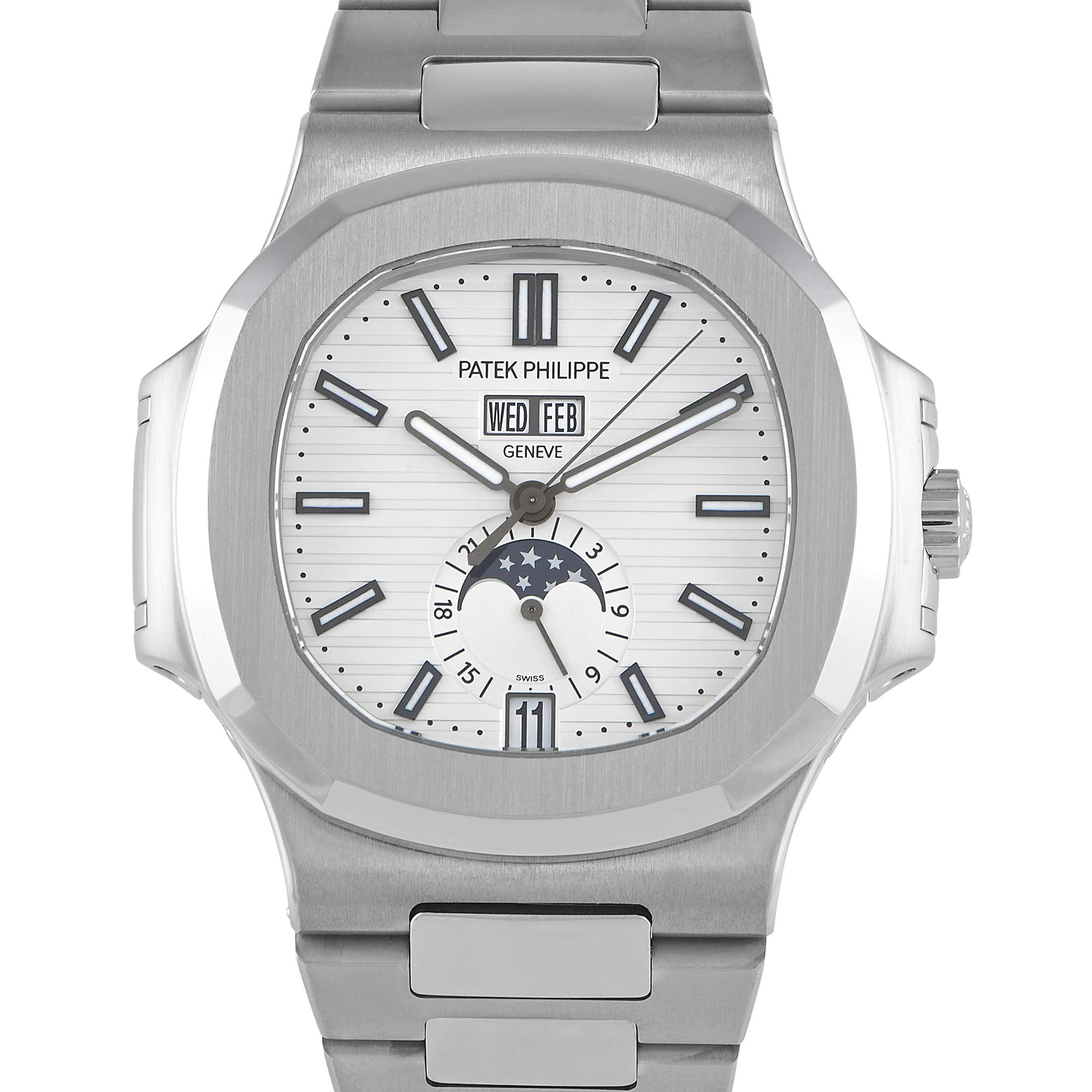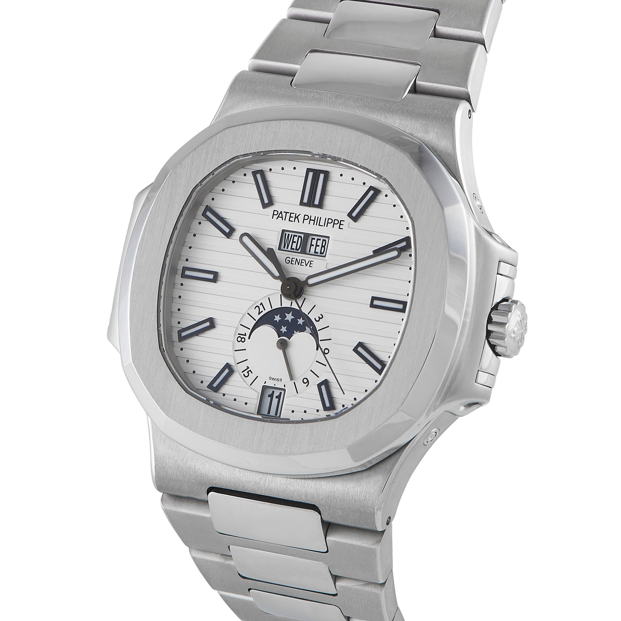 The Patek Philippe Nautilus Annual Calendar Moon Phase, reference number 5726/1A-010, is a member of the iconic “Nautilus” collection.