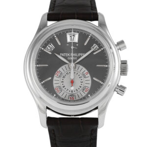 This pre-owned Patek Philippe Annual Calendar Chronograph Platinum Watch 5960P-001 comes with papers and a gift box.