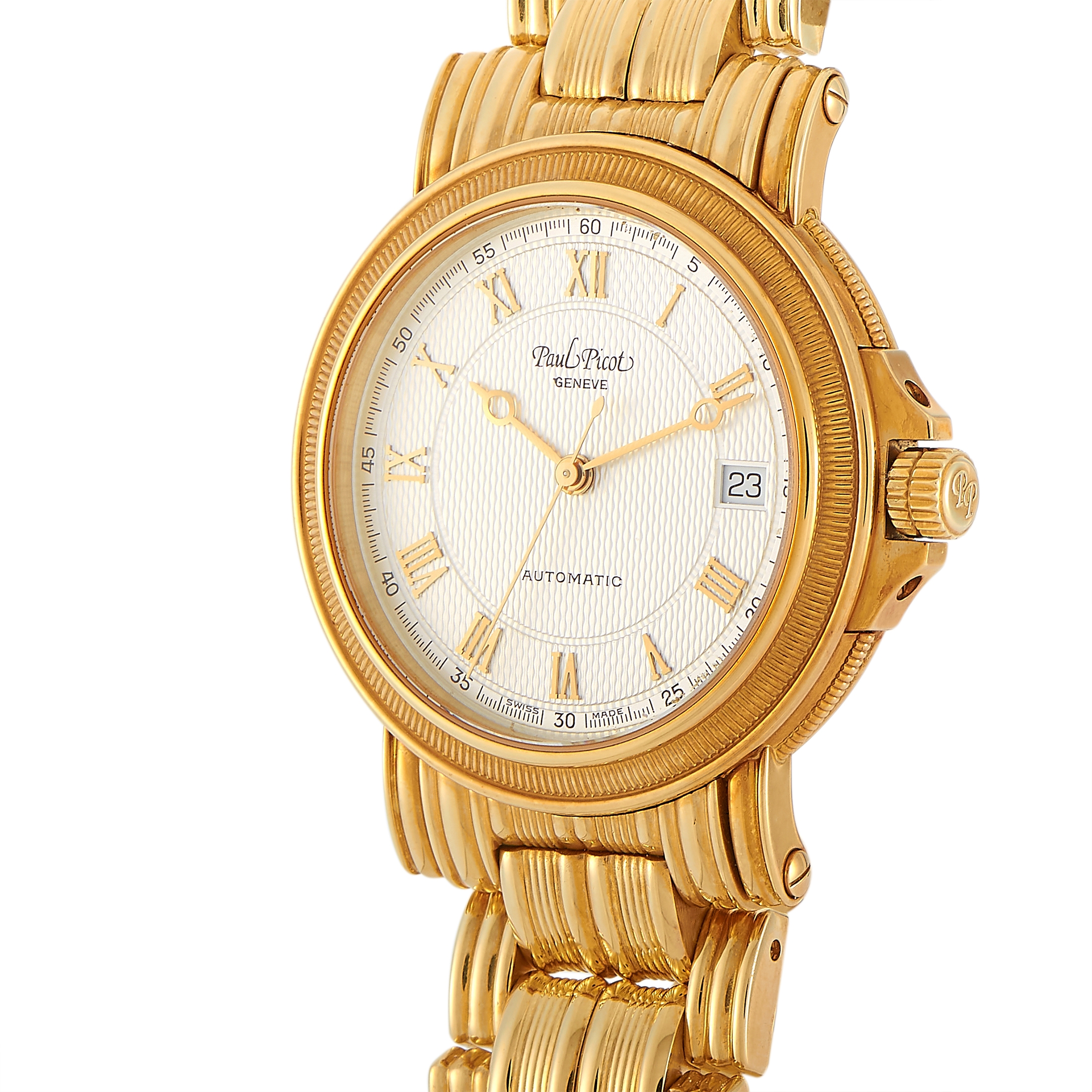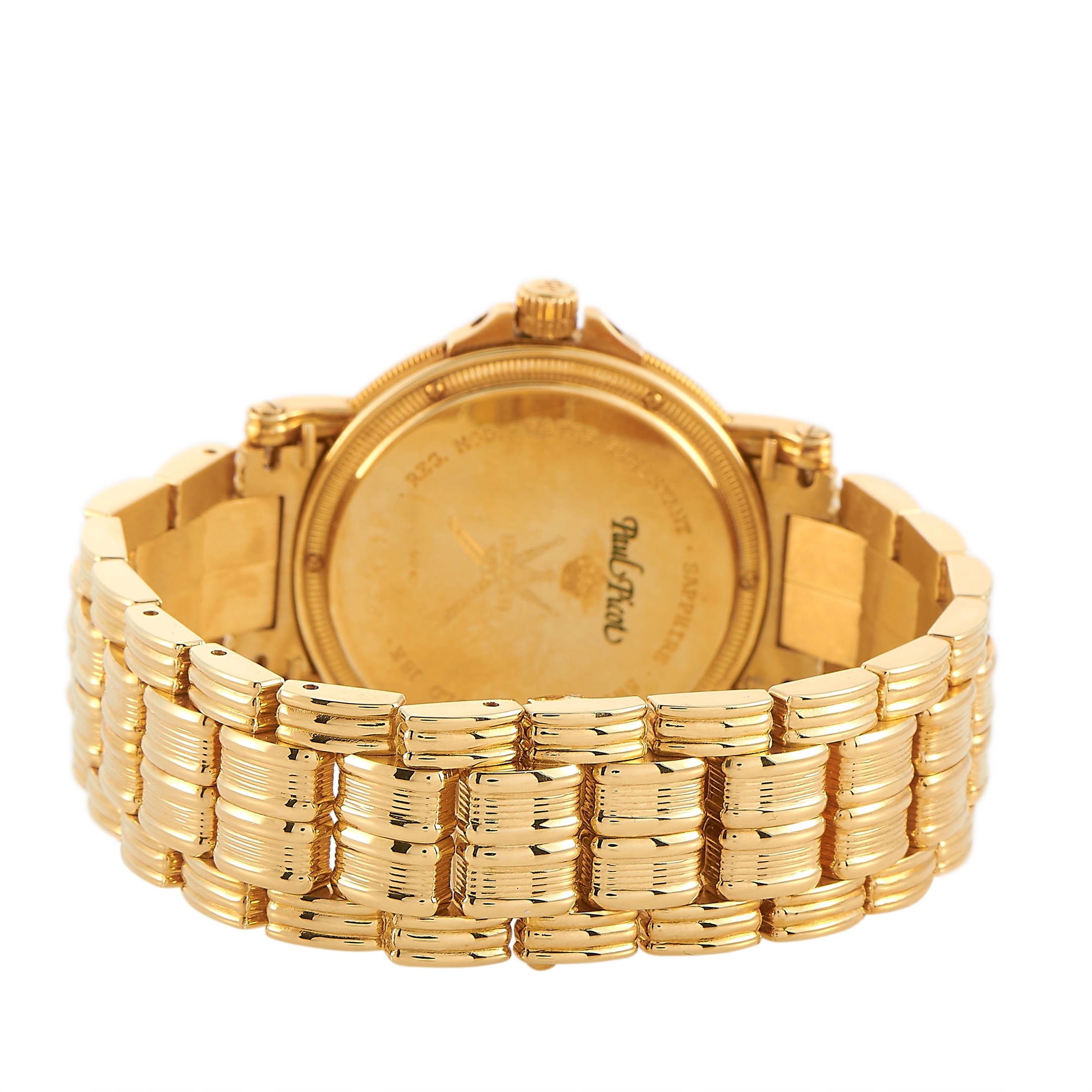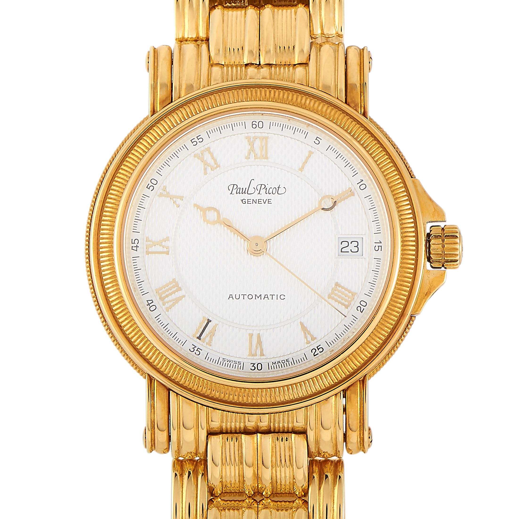 18K Yellow Gold adds luster and elegance to this impeccable piece. The 37mm case pairs beautifully with the matching bracelet band. On the white dial, you’ll also find golden Roman numerals, golden hands, and a date dial located at the 3-o-clock position. Minute markers surround the perimeter, adding a final touch to this inherently sophisticated piece. The solid case back displays the Omani Khanjar symbol, making this a very desirable watch for any collector.