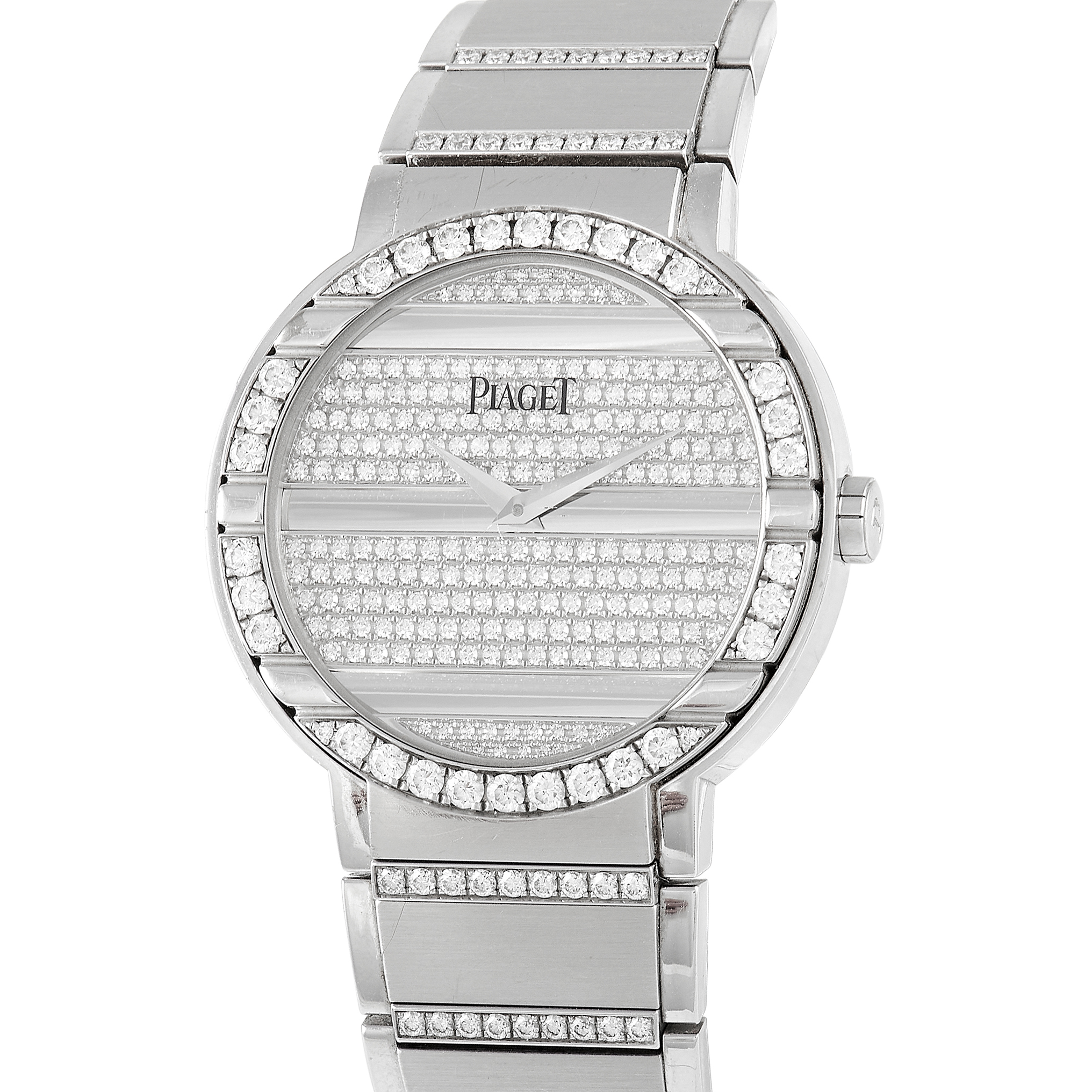 Clad entirely in 18K white gold and embellished elegantly with diamonds, this Piaget Polo ref.G0A29018 will make a shining statement on the wrist. The 38mm case is glamorously paired with diamond-paved dial and diamond-studded bezel. Both the bezel and dial display a horizontal pattern. Rounding out the luxurious profile of this timepiece are diamond accents on the bracelet. This time-only watch is powered by automatic movement. Although released as a men’s watch, this timepiece will also fit nicely on female wrists.