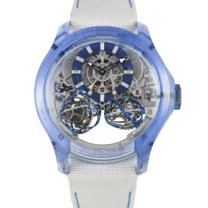 The Escape II Absolute Sapphire is literally one of its kind. This 48mm watch by Purnell has a case made entirely in sapphire, offering an unobstructed view of the P03 Double Spherion that runs inside the watch. The manual movement offers 32 hours of power reserve. At the upper half of the dial is a blue disc for time, with luminous hands and baguette diamond hour markers. The bottom half has double triple-axis tourbillon, with each outer cage set with 152 brilliant-cut diamonds.