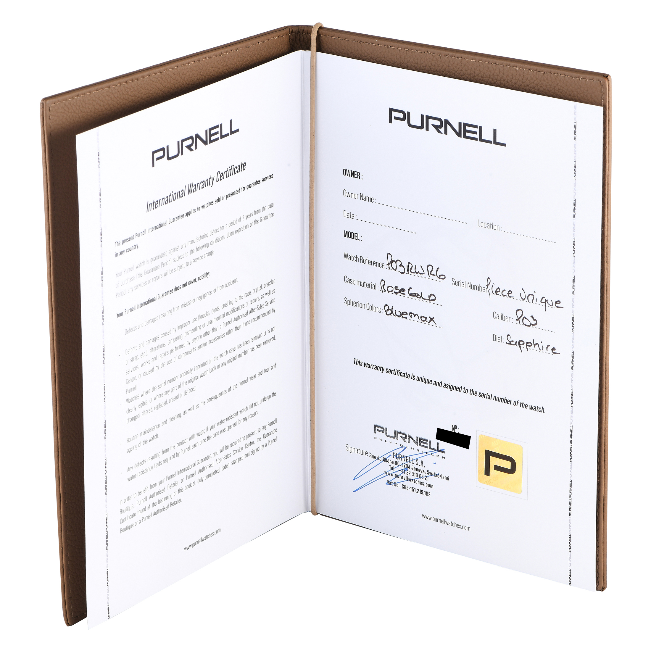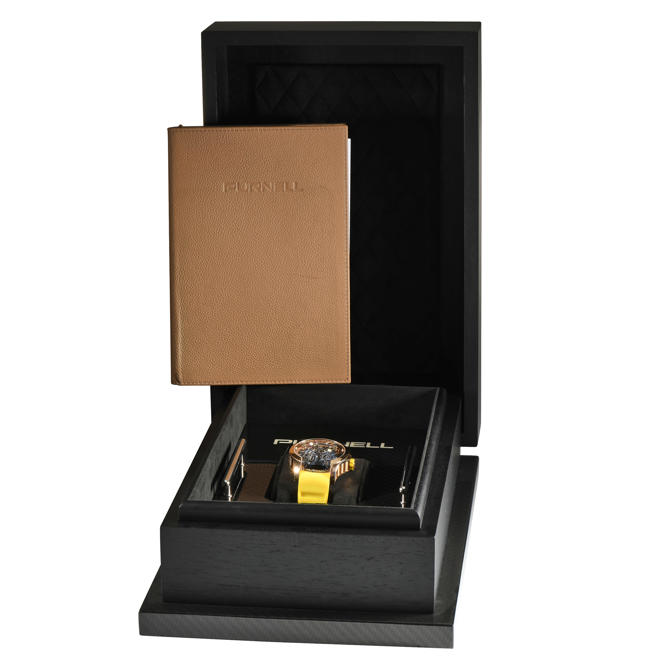 Papers and the manufacturer’s box accompany this pre-owned Purnell Escape II Rainbow Piece Unique 18K Rose Gold Watch P03RWRG.