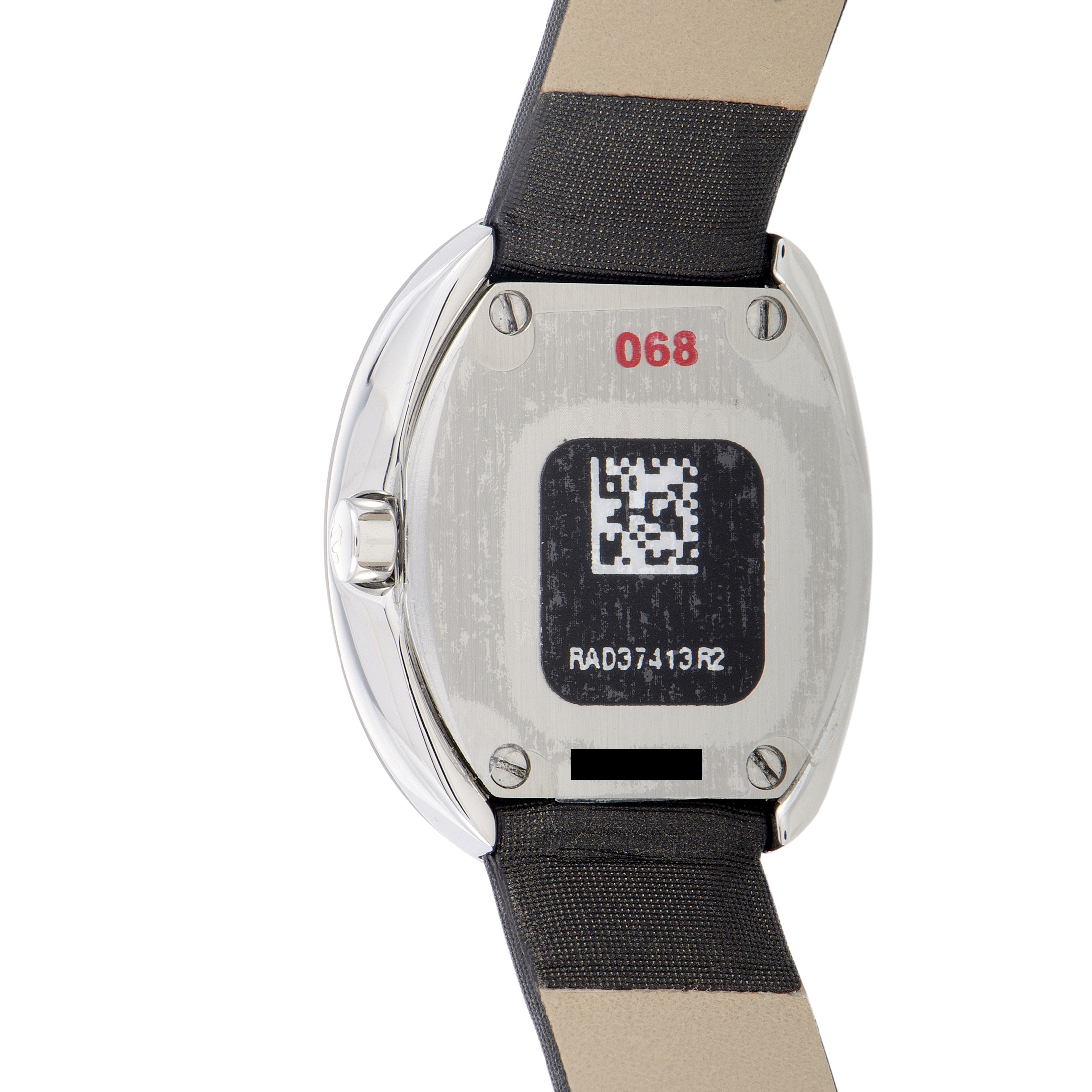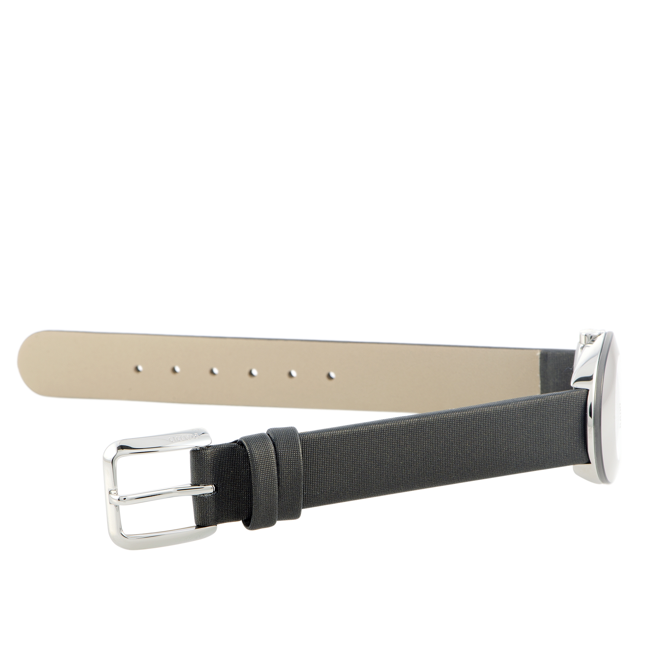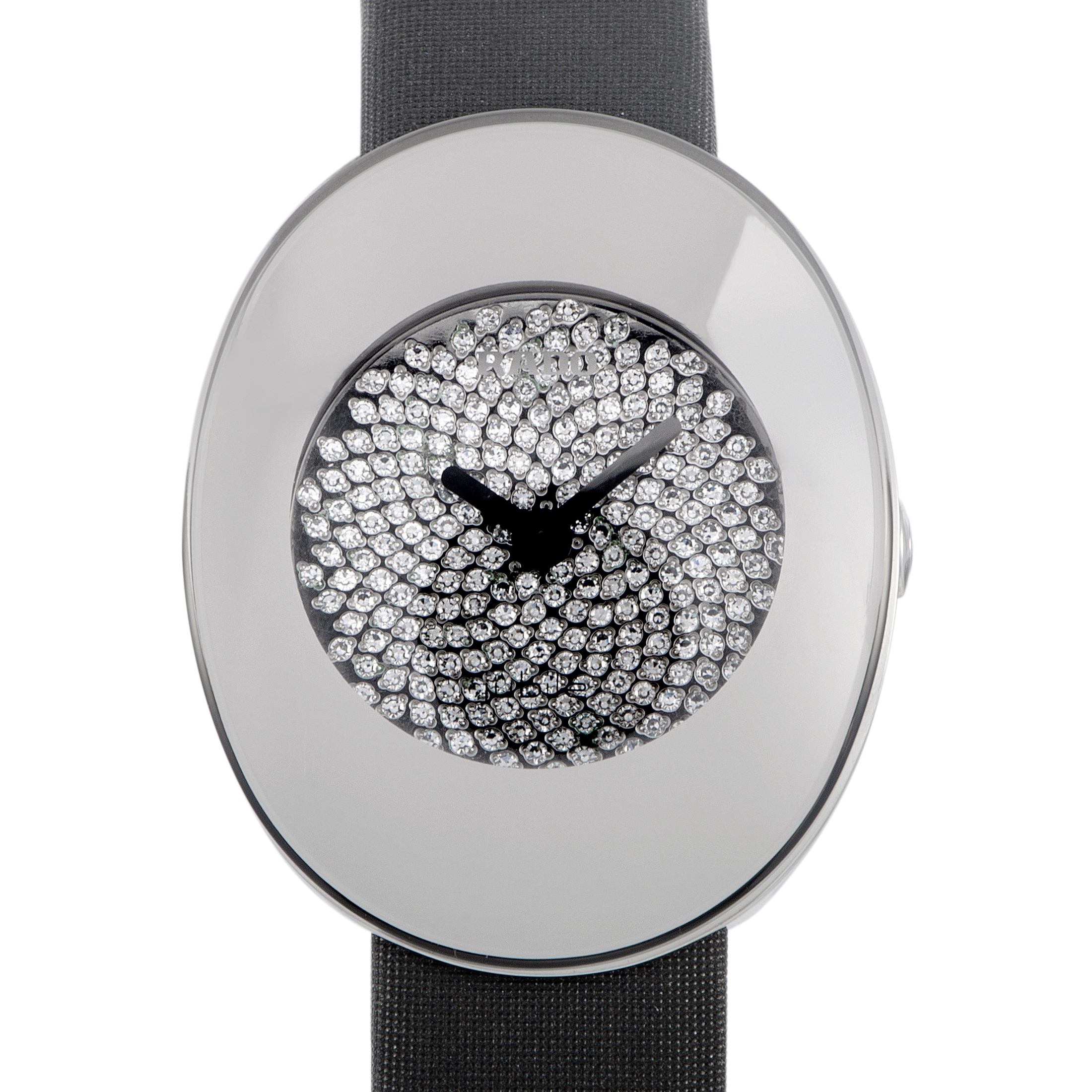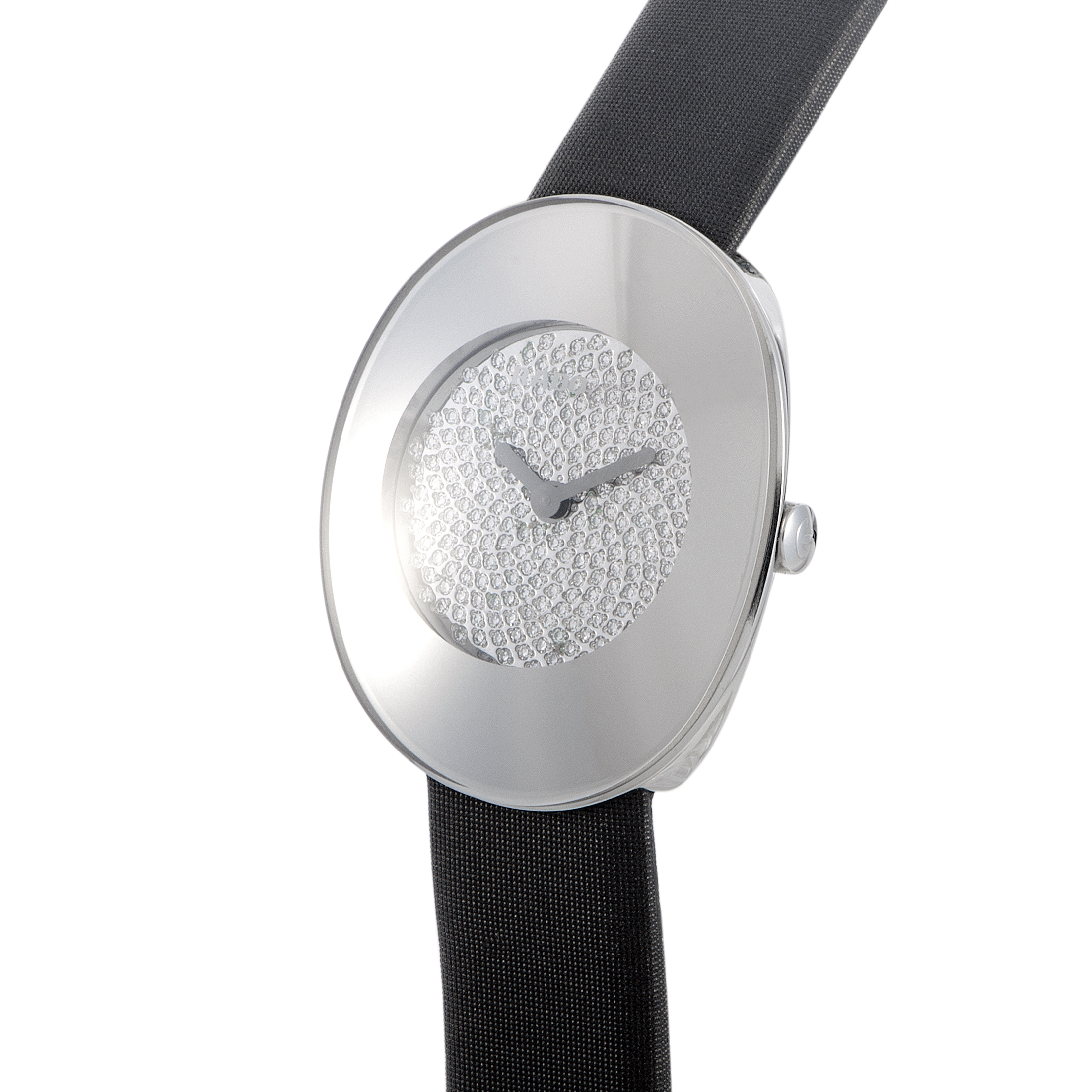 The Rado Montres Esenza Pavé, reference number R53921706/01.963.0921.3.070, boasts a stainless steel case presented on a black satin and leather strap, secured on the wrist with a tang buckle. This model is powered by a quartz movement and indicates hours and minutes on the diamond-paved dial. The watch is water-resistant to 30 meters.