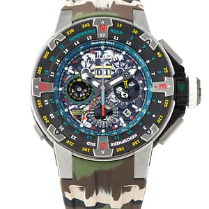 Limited to only 80 pieces, the Richard Mille RM 60-01 Les Voiles de St-Barth Chronograph is a massive timepiece that leaves an equally massive impression. It features a bold 50mm case crafted from titanium and carbon, paired with sapphire crystals on both front and back sides for full visibility of the movement. The dial features luminous dot hour markers, luminous and oversized hour and minute hands, a large date window below 12, a month display, chronograph sub-dials, and a second time zone indicator. The bi-directional bezel features a functional compass for orientation. At its heart is RMAC2, a high-performance automatic chronograph movement that embodies Richard Mille’s bold design philosophy. Fully skeletonized and visible from both front and back, the movement unites avant-garde visuals with cutting-edge performance. A camouflage-inspired rubber strap completes the rugged look of this bold watch.