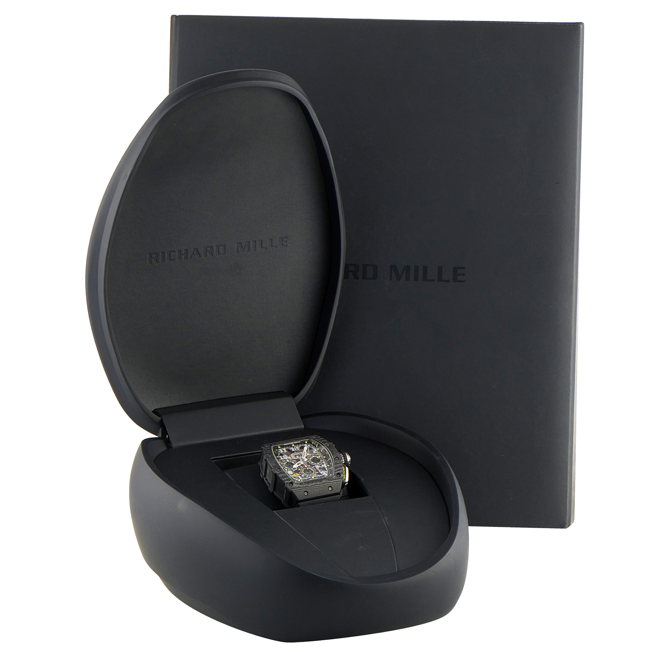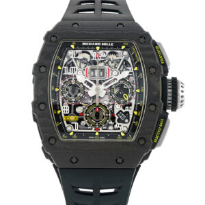 This is a pre-owned Richard Mille RM11-03 Carbon TPT All Black Chronograph Watch, accompanied by papers and the manufacturer’s box.