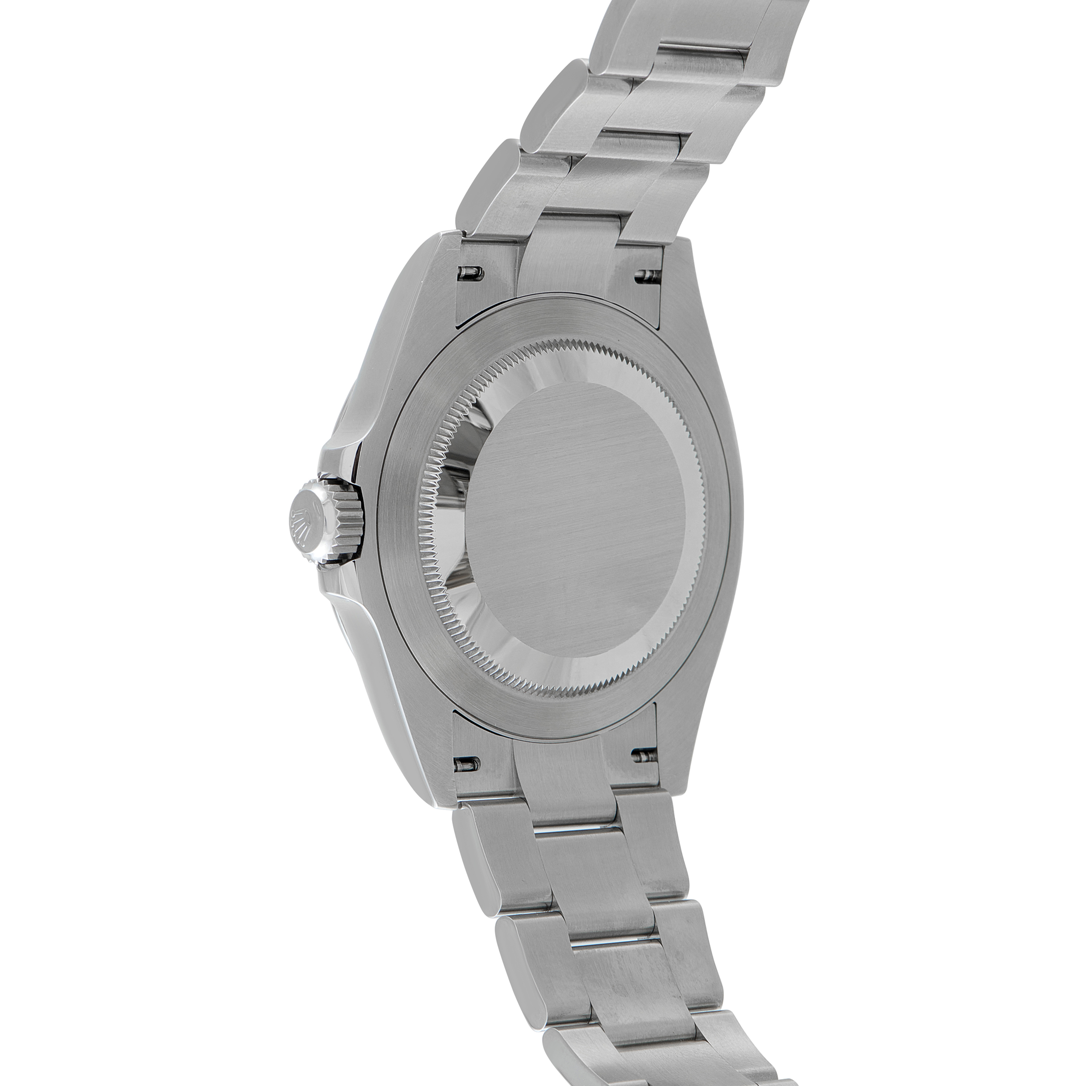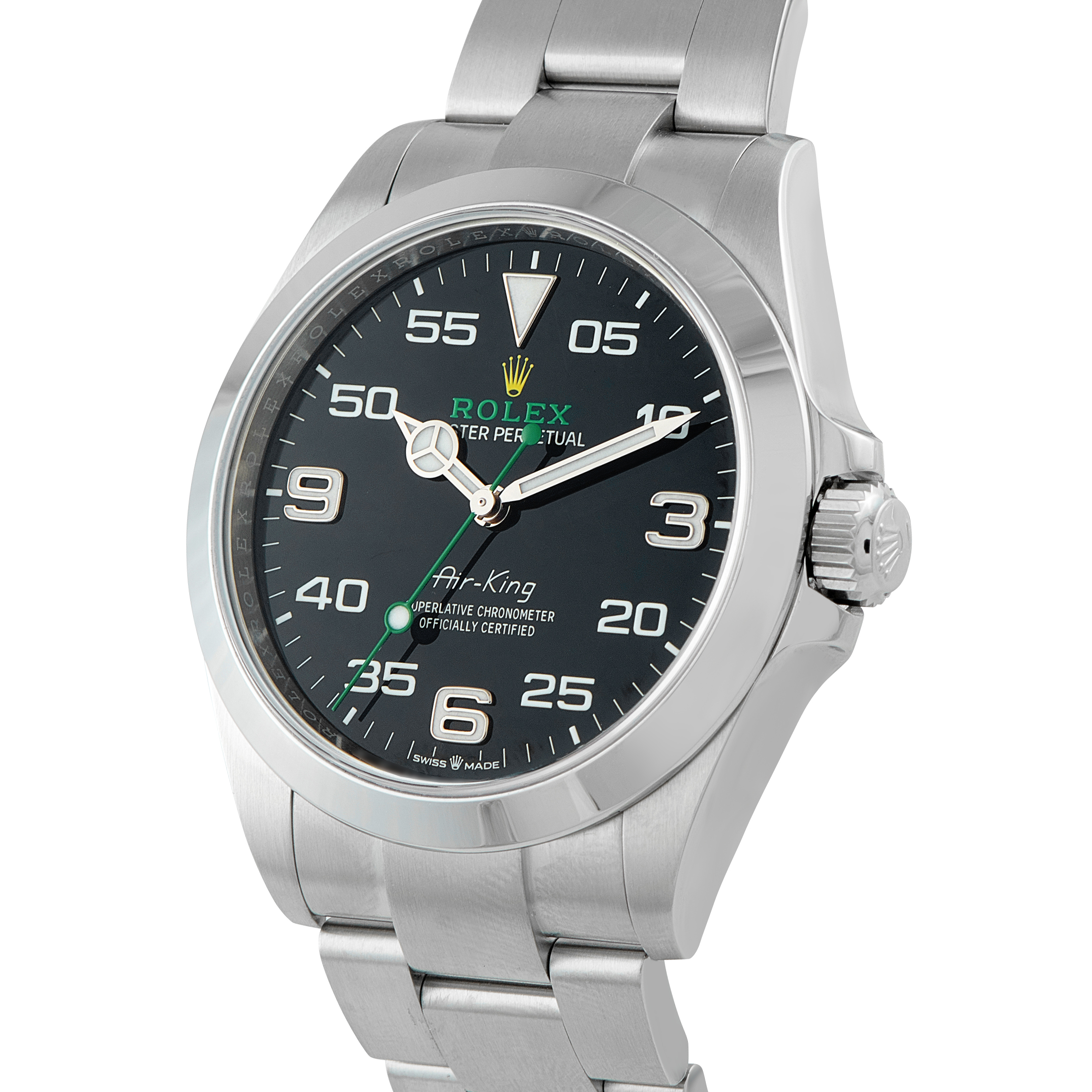 Not the obvious choice, and that is precisely the point. Collectors gravitate to the Air-King because it resists predictability. The Rolex Air-King ref. 126900 features a black dial combining large 3-6-9 numerals with a prominent minute scale calibrated in five-minute increments. The green seconds hand and logo introduce color in a way few other references attempt. The 40mm Oystersteel case includes crown guards, aligning it visually with the broader sports family while preserving its aviation identity. Powering this reference is Caliber 3230, delivering Superlative Chronometer certification and a 70-hour reserve through its efficient Chronergy escapement.