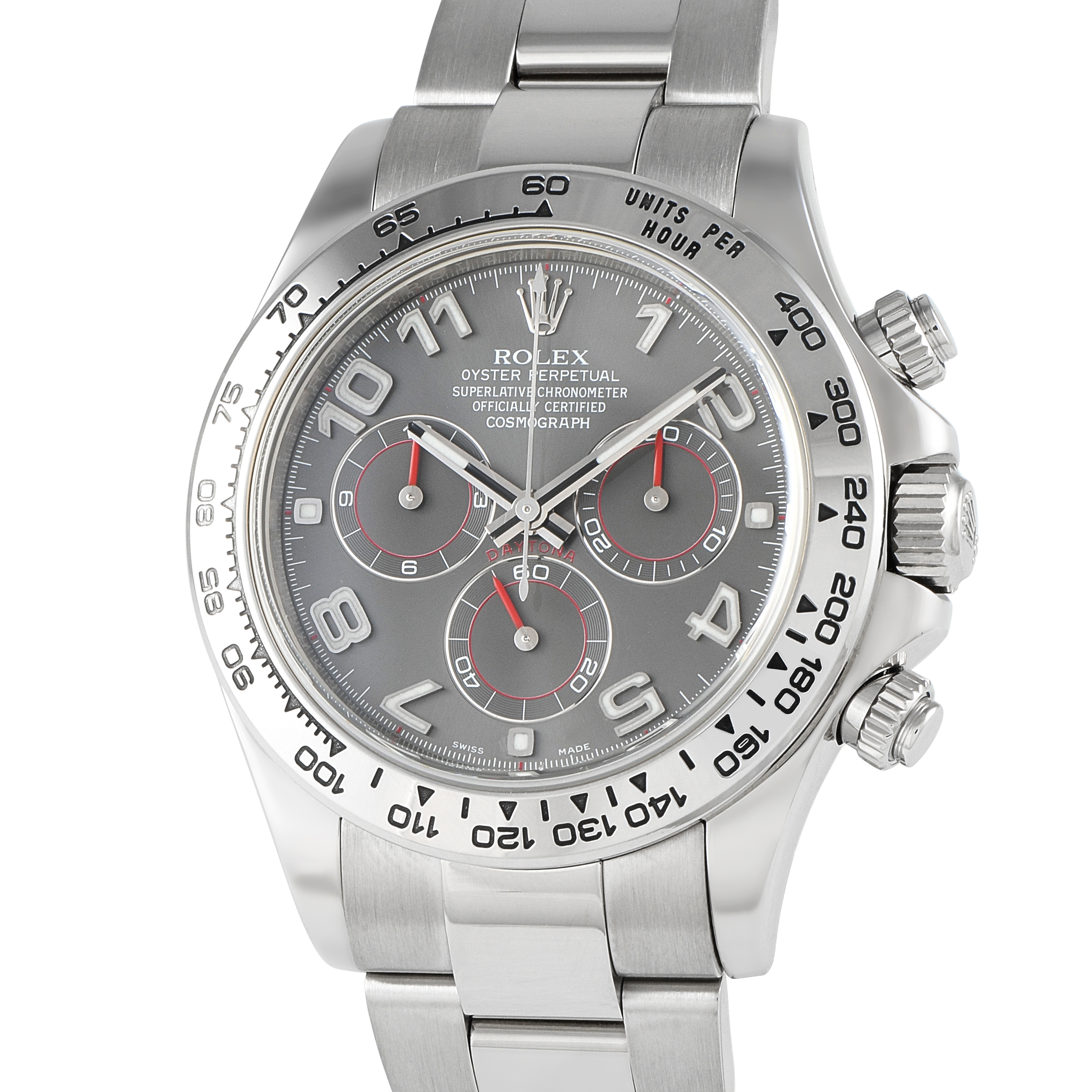 Ideal for anyone who appreciates Rolex’s attention to detail, this timepiece features a 40mm 18K White Gold case, a fixed 18K White Gold bezel with an engraved tachymetric scale, and an 18K White Gold Oyster bracelet. The black dial comes complete with luminous hands, Arabic numeral hour markers, and a trio of red chronograph subdials displaying 60 seconds, 30 minutes, and 12 hours. This impeccably crafted timepiece is powered by an automatic Rolex Calibre 4130 movement with 72 hours of reserve time and is water resistant up to 100 meters.