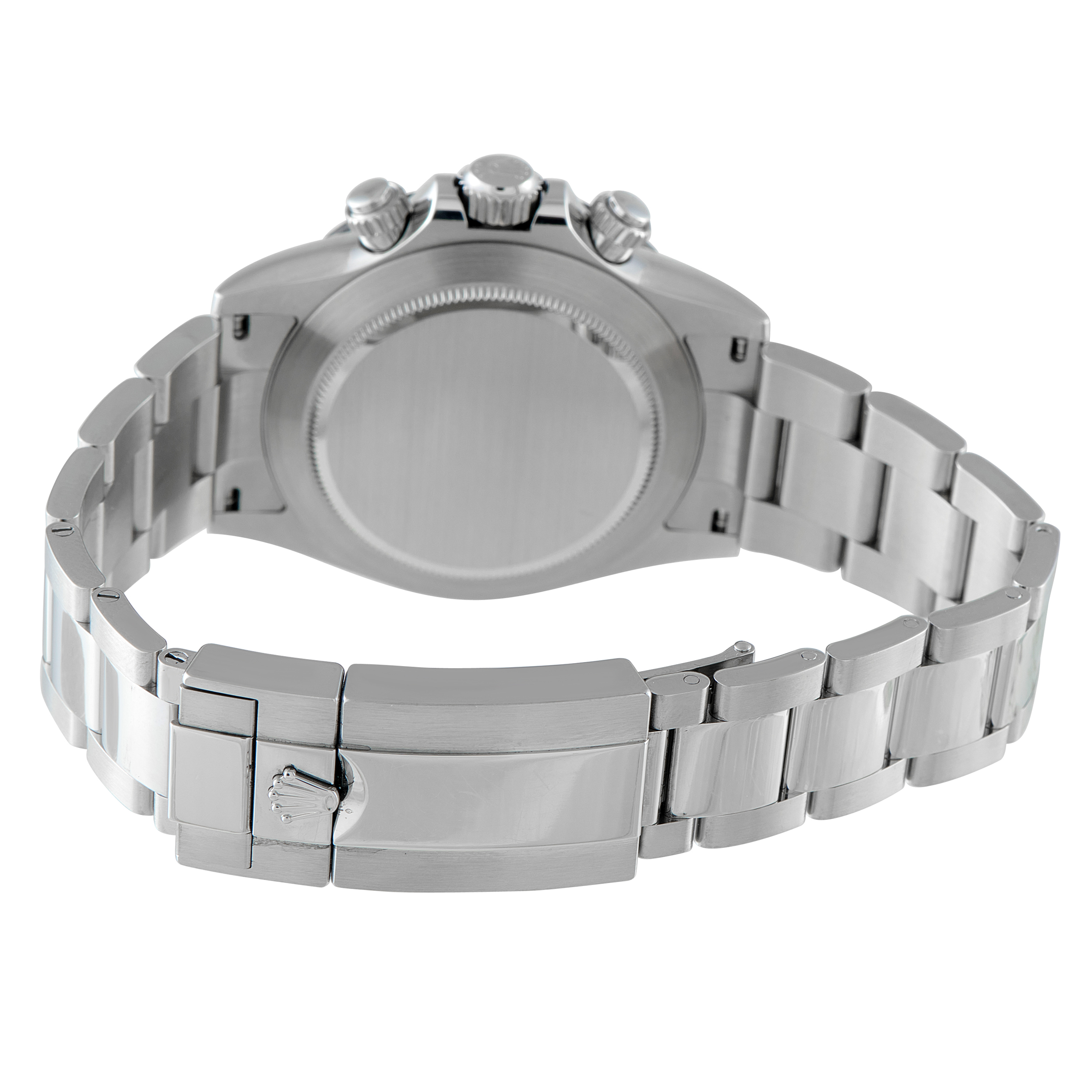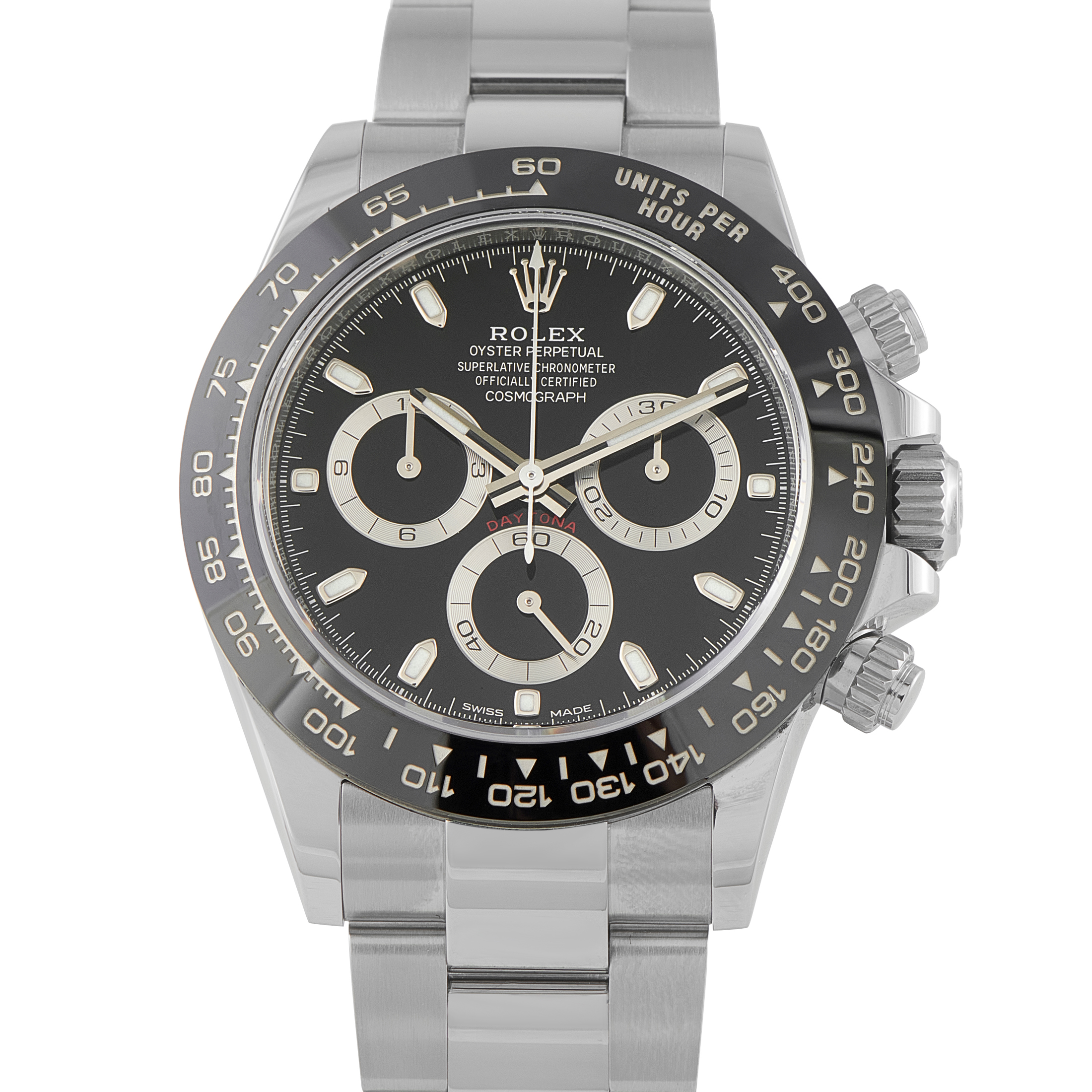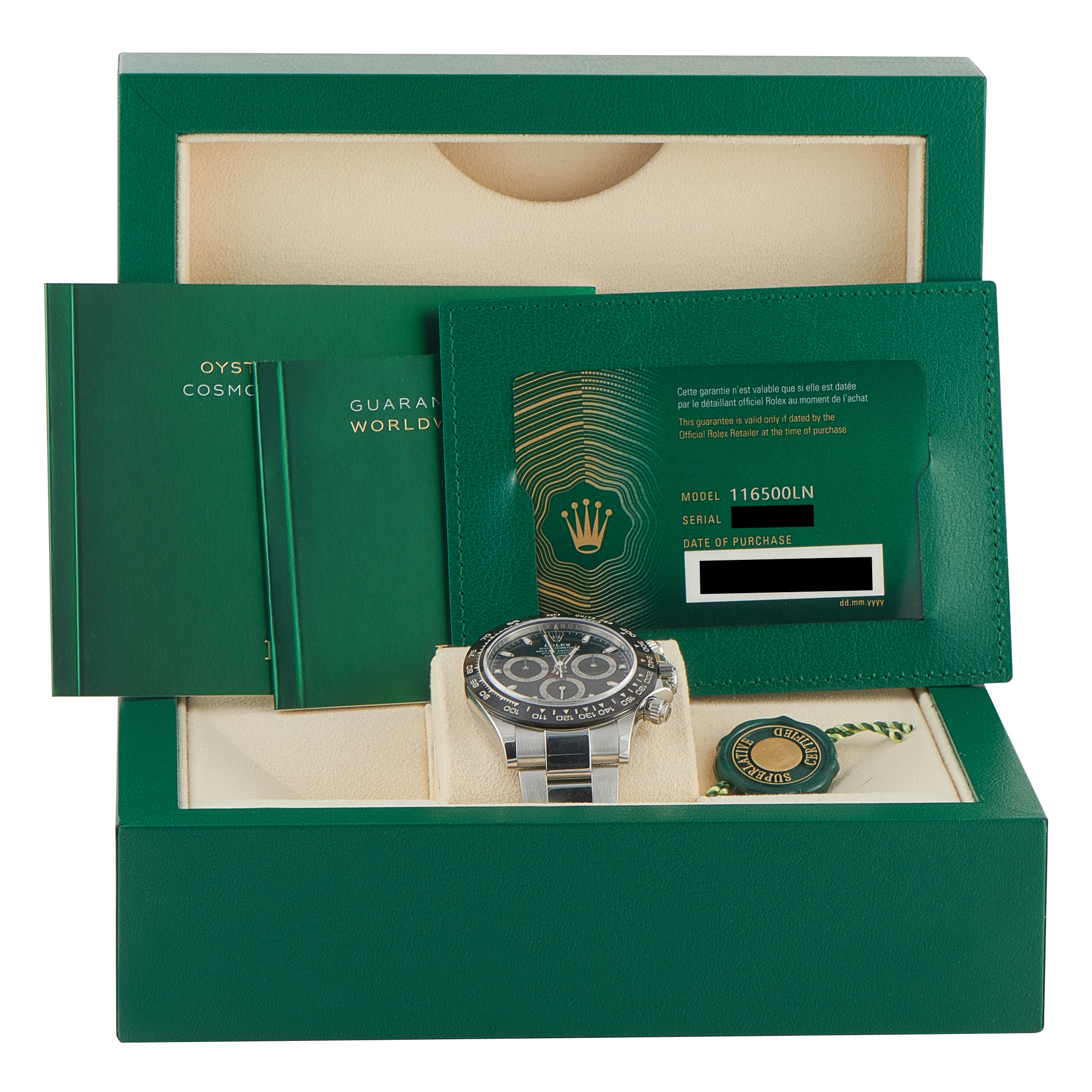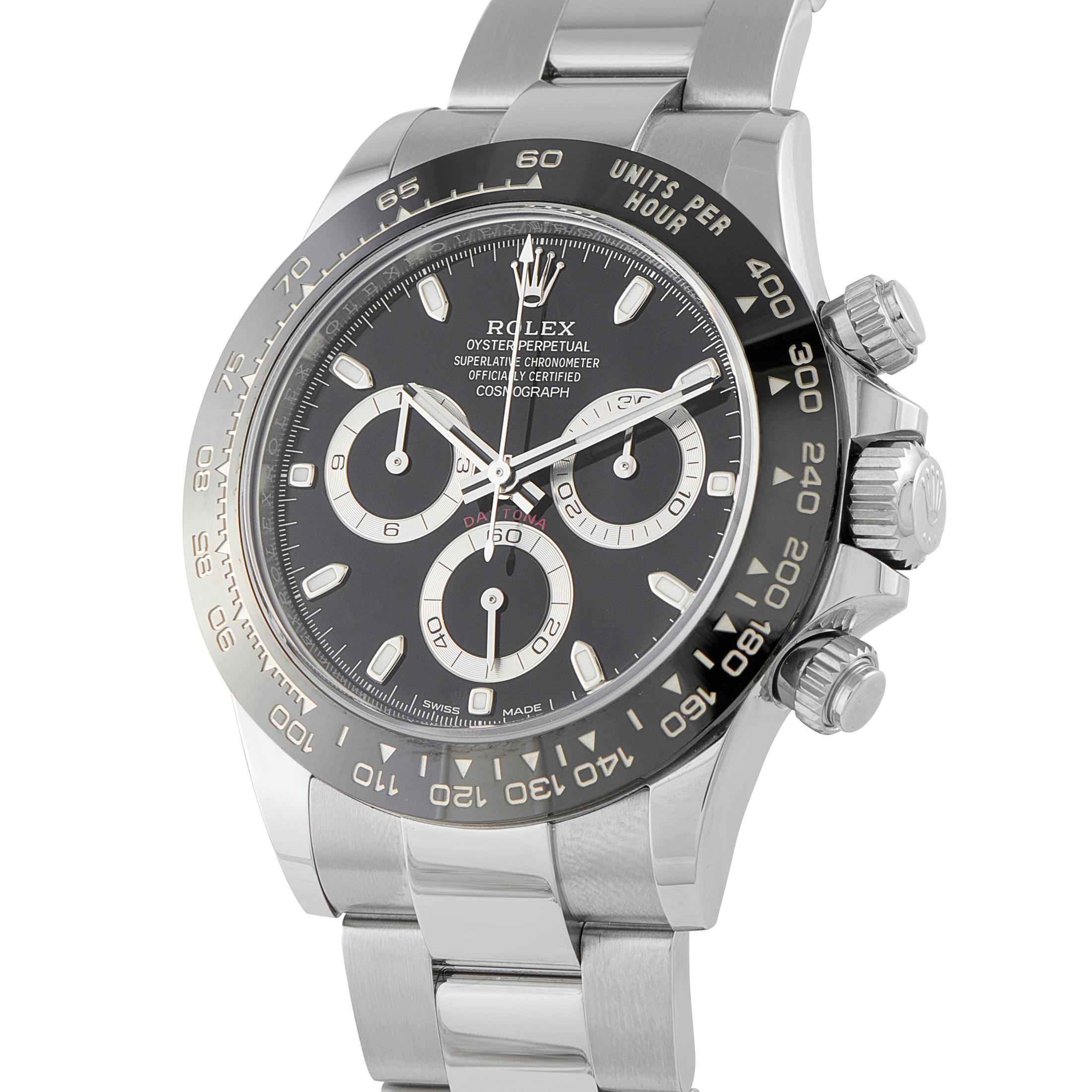 This is a pre-owned Rolex Cosmograph Daytona Black Dial Oystersteel Watch 116500. It is accompanied by all requisite documentation and the manufacturer’s box.