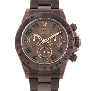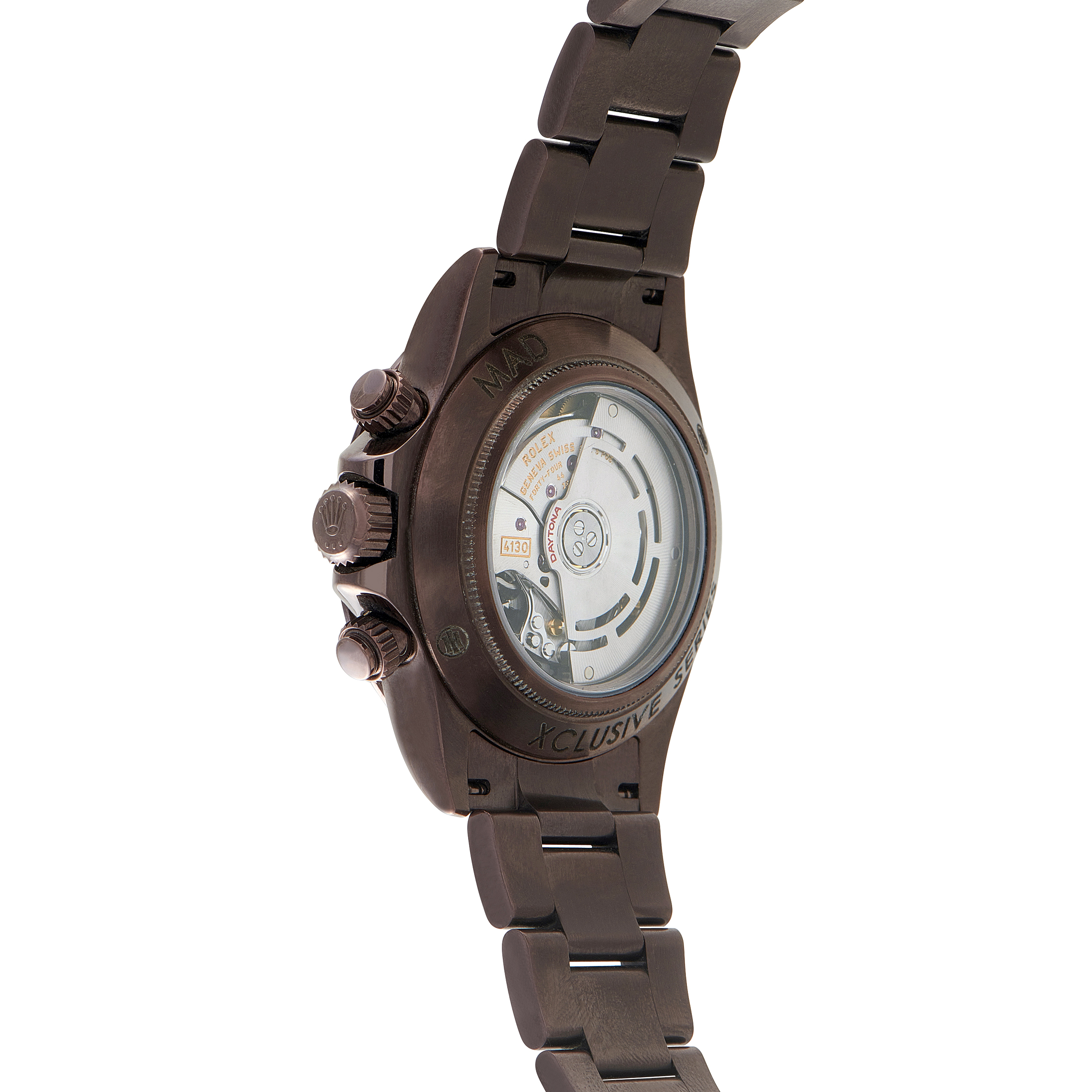 Here, the iconic Rolex Cosmograph Daytona is custom coated in brown diamond-like carbon finish. Despite the alterations, MAD Paris is committed to keeping the original model’s unique construction intact. This watch comes complete with a 40mm Oystersteel case, an Oystersteel Bezel, and an Oyster bracelet. The brown dial includes luminous hands, Arabic numeral hour markers, and a trio of chronograph subdials. It’s powered by an automatic Rolex Calibre 4130 movement with 72 hours of reserve time and is water resistant up to 100 meters.