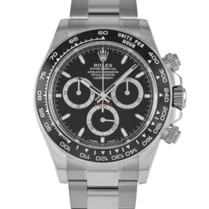 Papers and the manufacturer’s box accompany this pre-owned Rolex Cosmograph Daytona Black Dial Men’s Watch 126500LN.