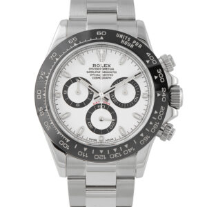 Offered pre-owned, this Rolex Cosmograph Daytona White Panda Dial Watch 116500LN comes complete with papers and the manufacturer’s box.