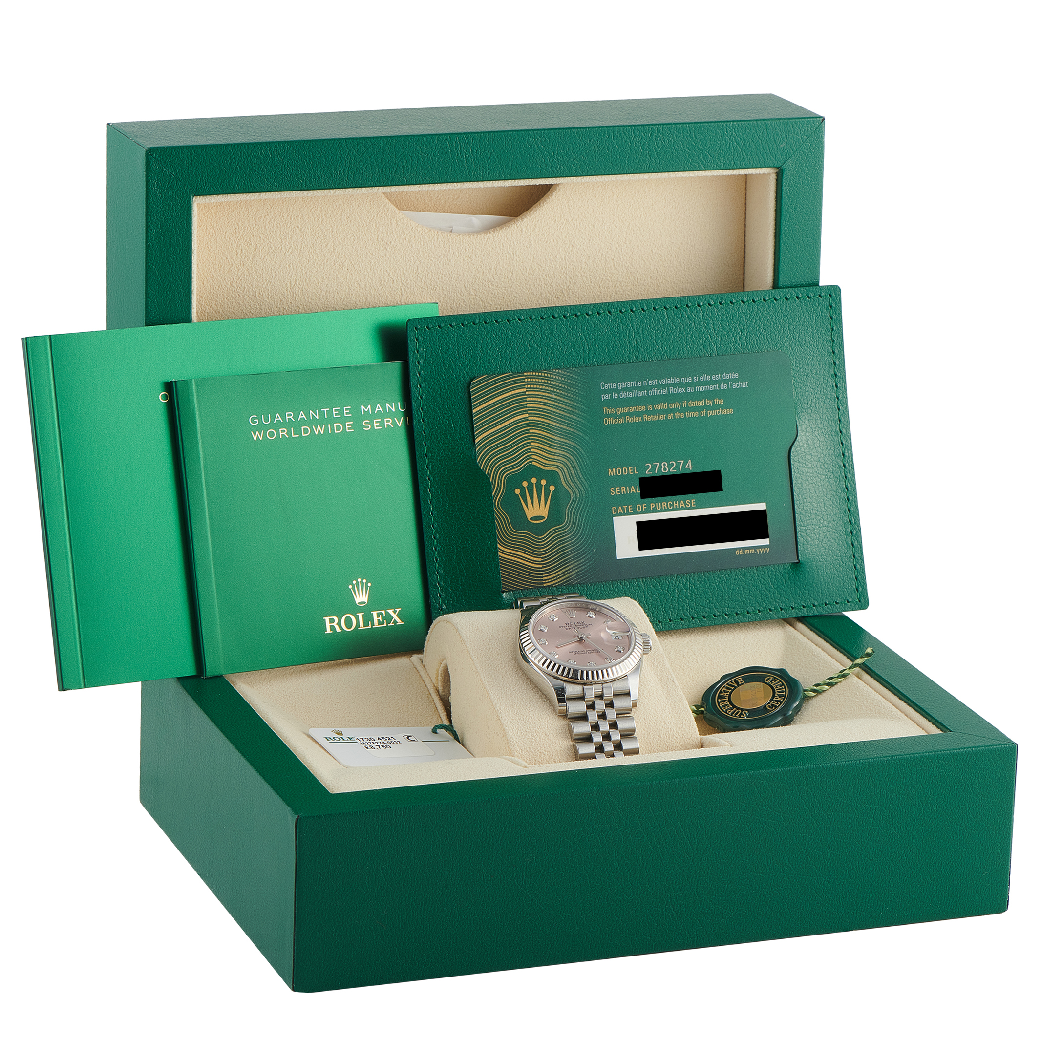 This is a pre-owned Rolex Datejust 31 Diamond-Set Pink Dial Ladies Watch M278274. It comes with papers and the manufacturer’s box.