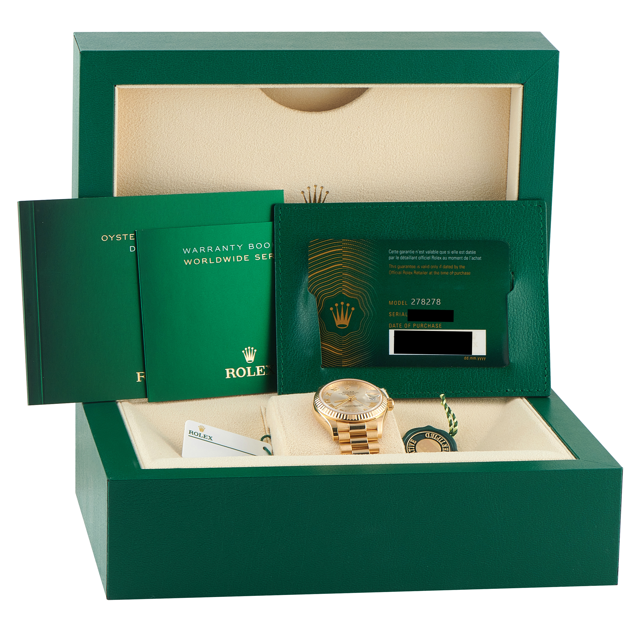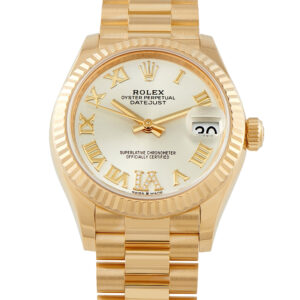 The modern Datejust 31 ref. 278278-0028 is executed entirely in 18k yellow gold. The fluted bezel frames a 31mm case with a silver dial set with applied Roman numerals. The diamond-set VI marker catches and reflects light across the metallic surface, while the Cyclops lens magnifies the date at three, allowing the wearer to read it instantly. The President bracelet, with its concealed Crownclasp, maintains the watch’s formal character. Rolex equipped this full-gold daily timepiece with caliber 2236, a self-winding movement with a Syloxi silicon hairspring and a 55-hour power reserve.