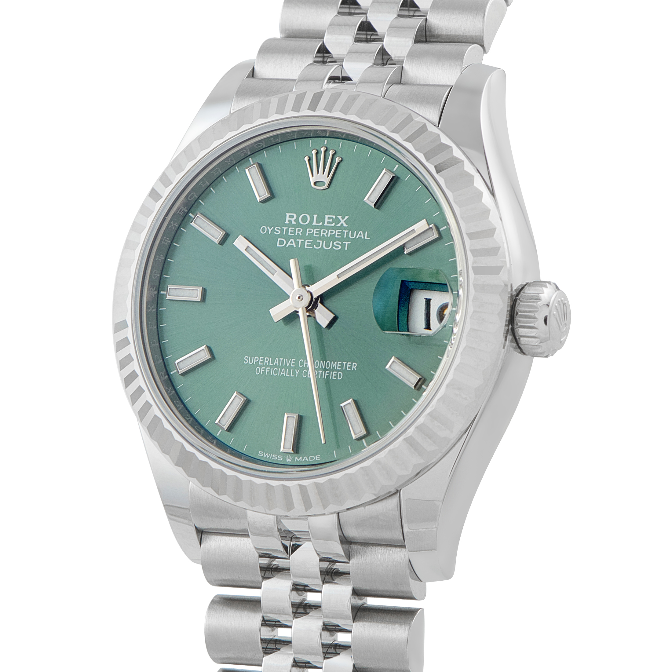 The Rolex Datejust 31 ref. 278274 is positioned within the brand’s women’s catalog, but the 31mm case size places it firmly in unisex territory by contemporary standards. This mid-size Datejust is in white Rolesor, combining Oystersteel with an 18k white gold fluted bezel. The mint green dial adds a modern note within a classic framework, while the automatic Caliber 2236 provides chronometer-certified precision.