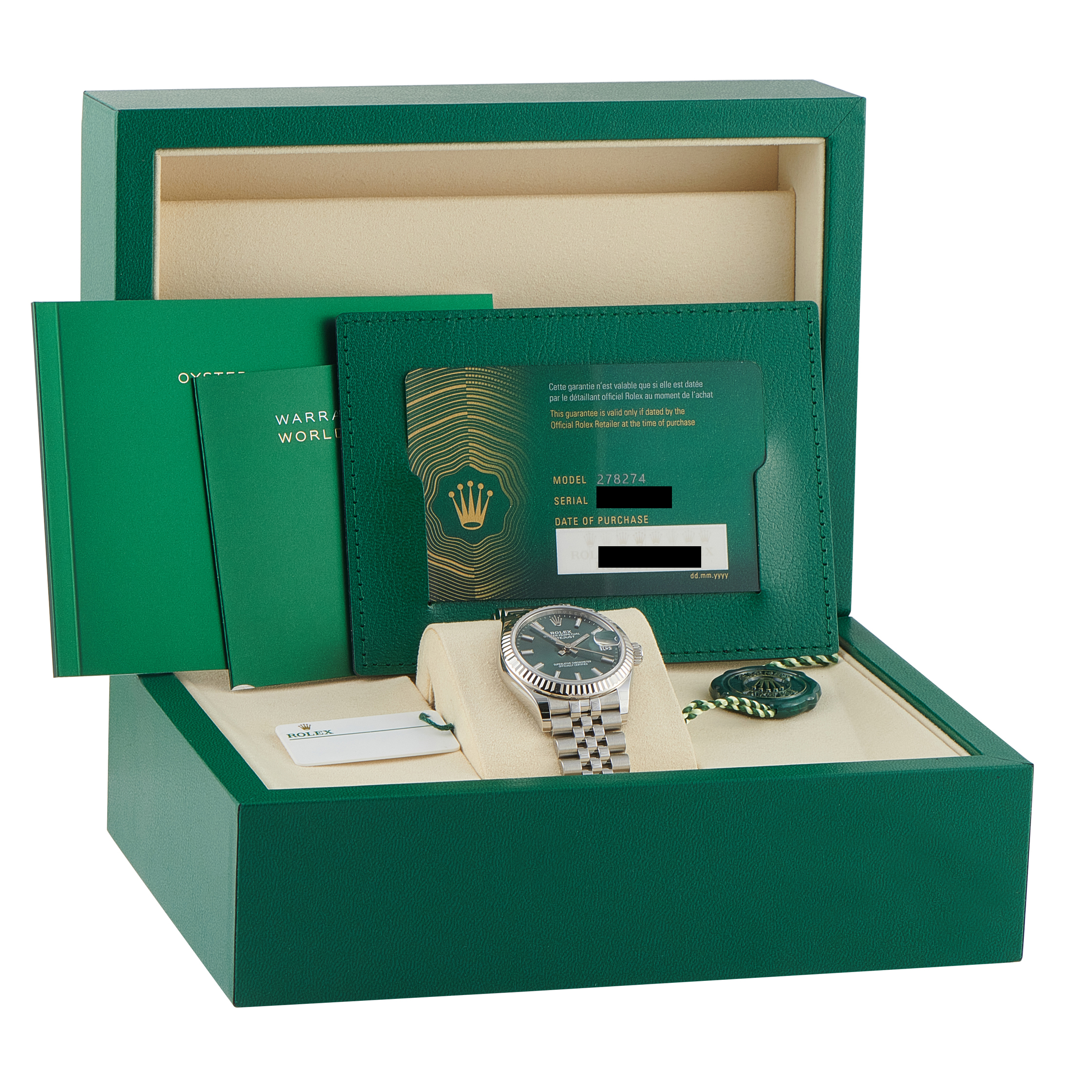 This is an unworn Rolex Datejust 31 Mint Green Dial White Rolesor Watch 278274. It is accompanied by the manufacturer’s box and papers.