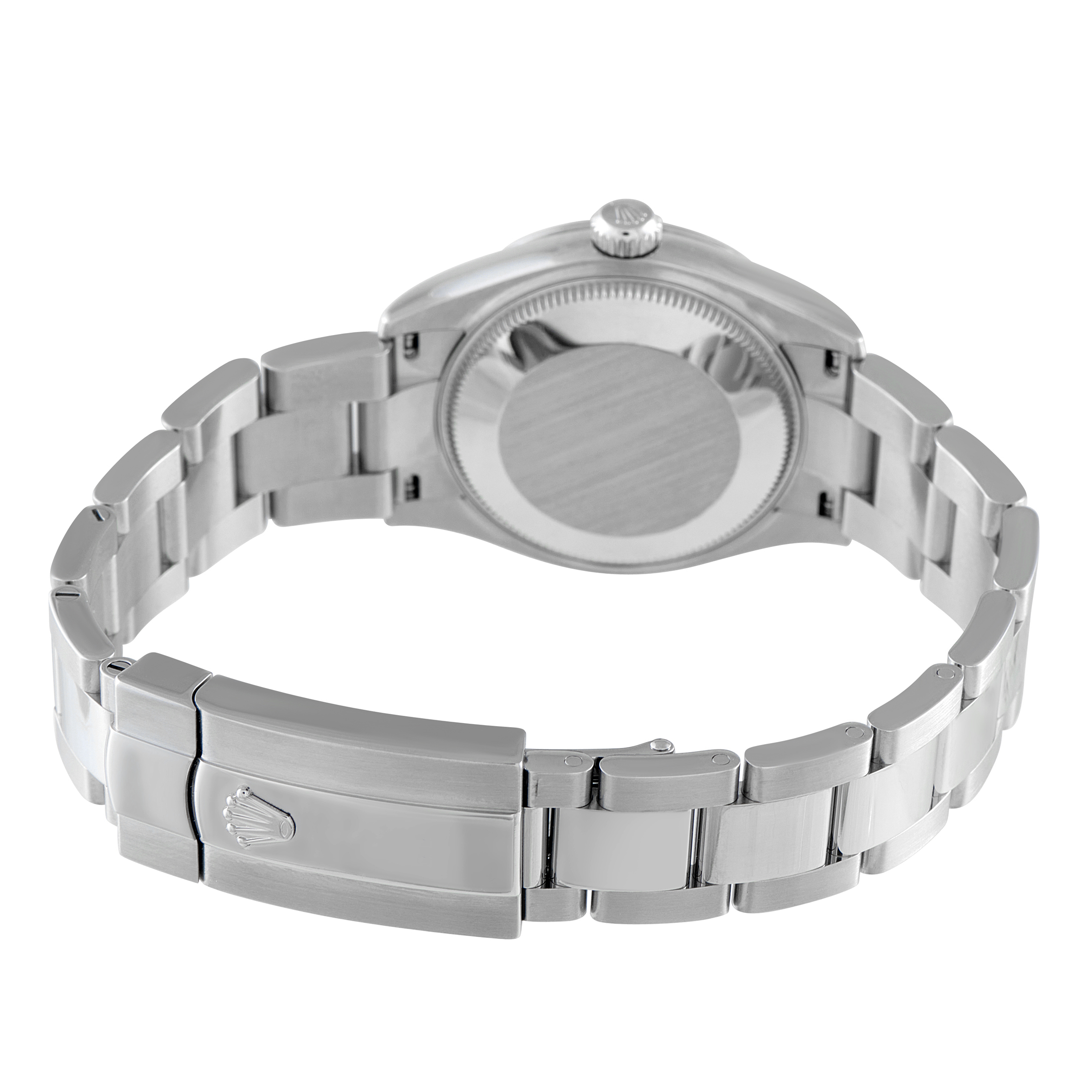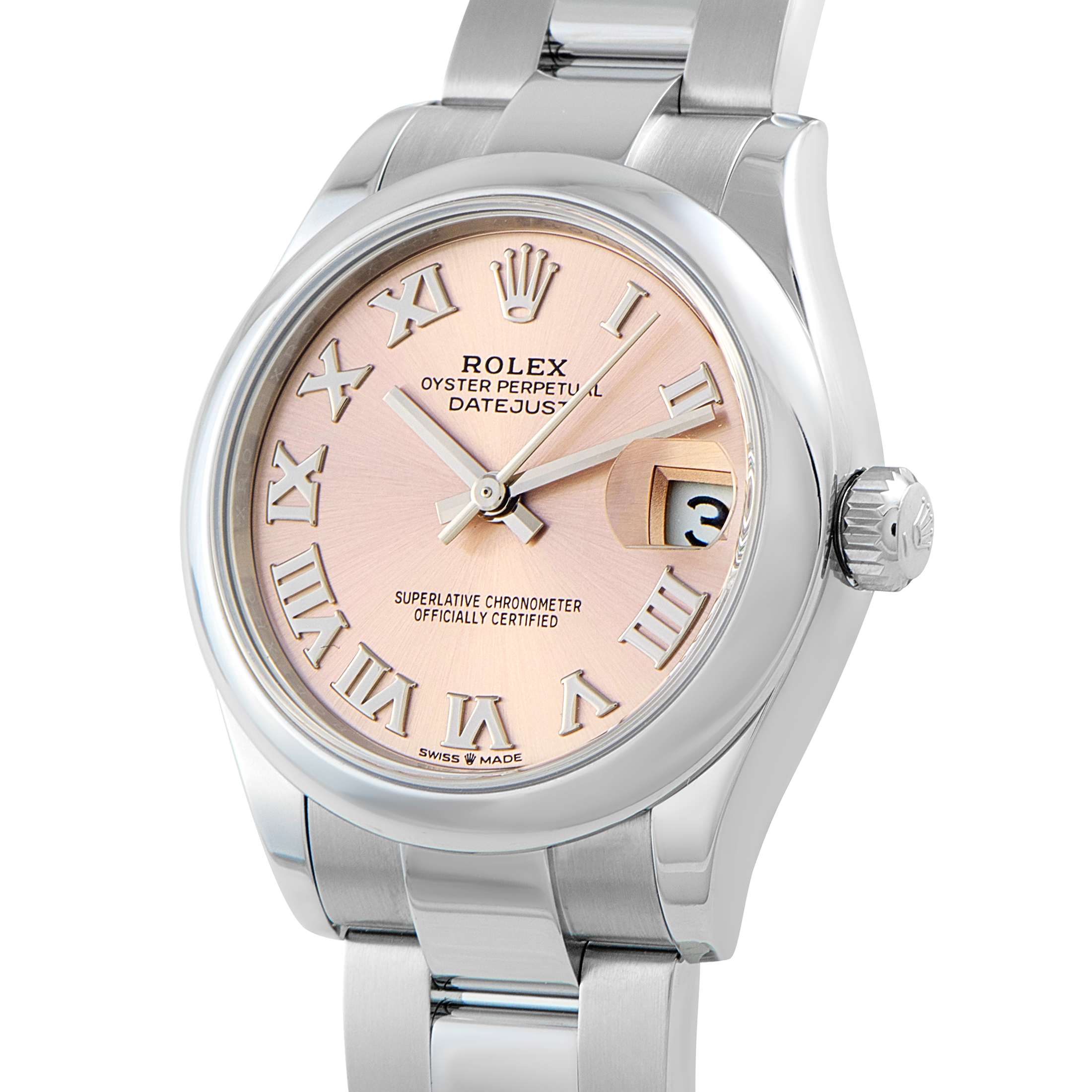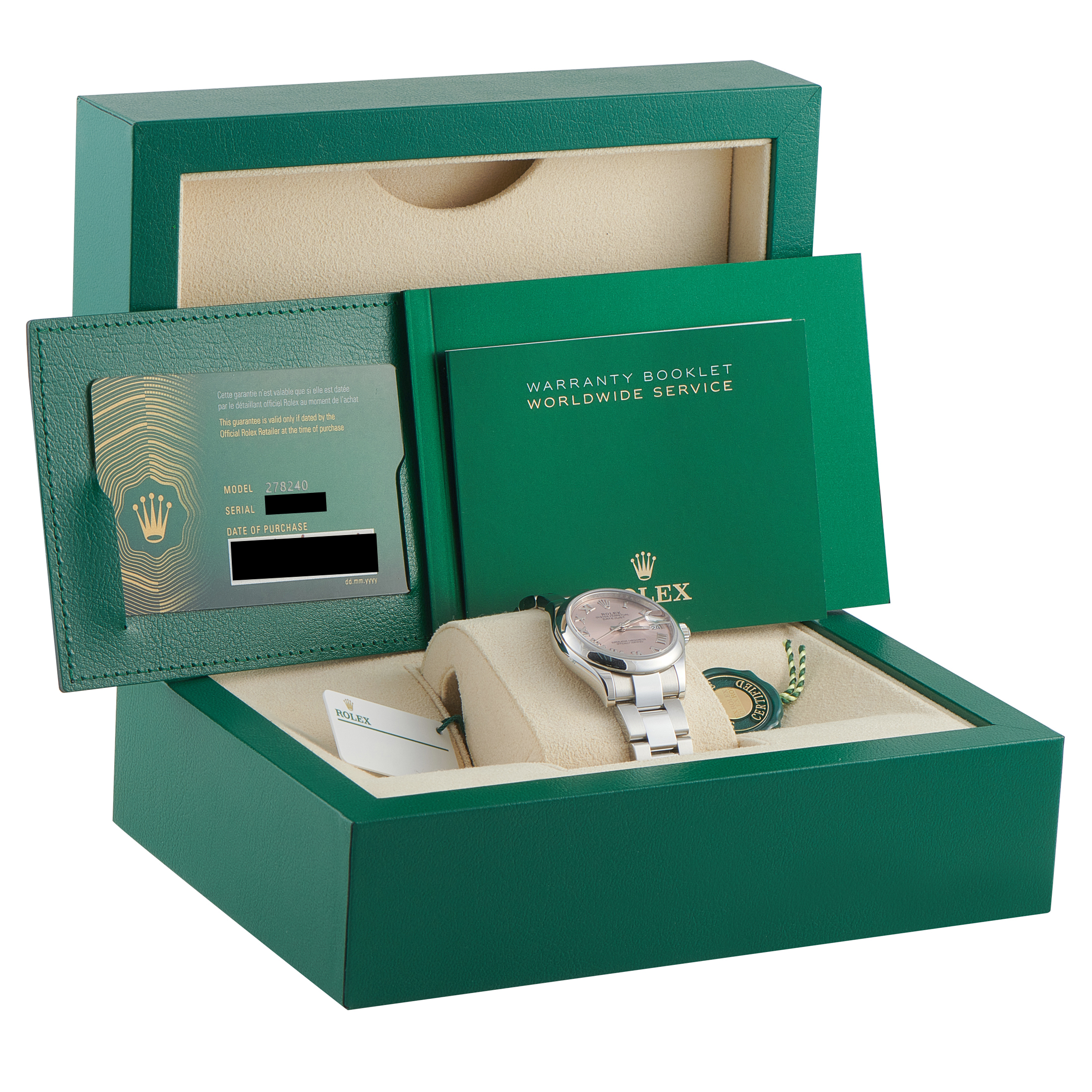 Papers and the manufacturer’s box accompany this pre-owned Rolex Datejust 31 Pink Roman Dial Oystersteel Ladies Watch 278240.