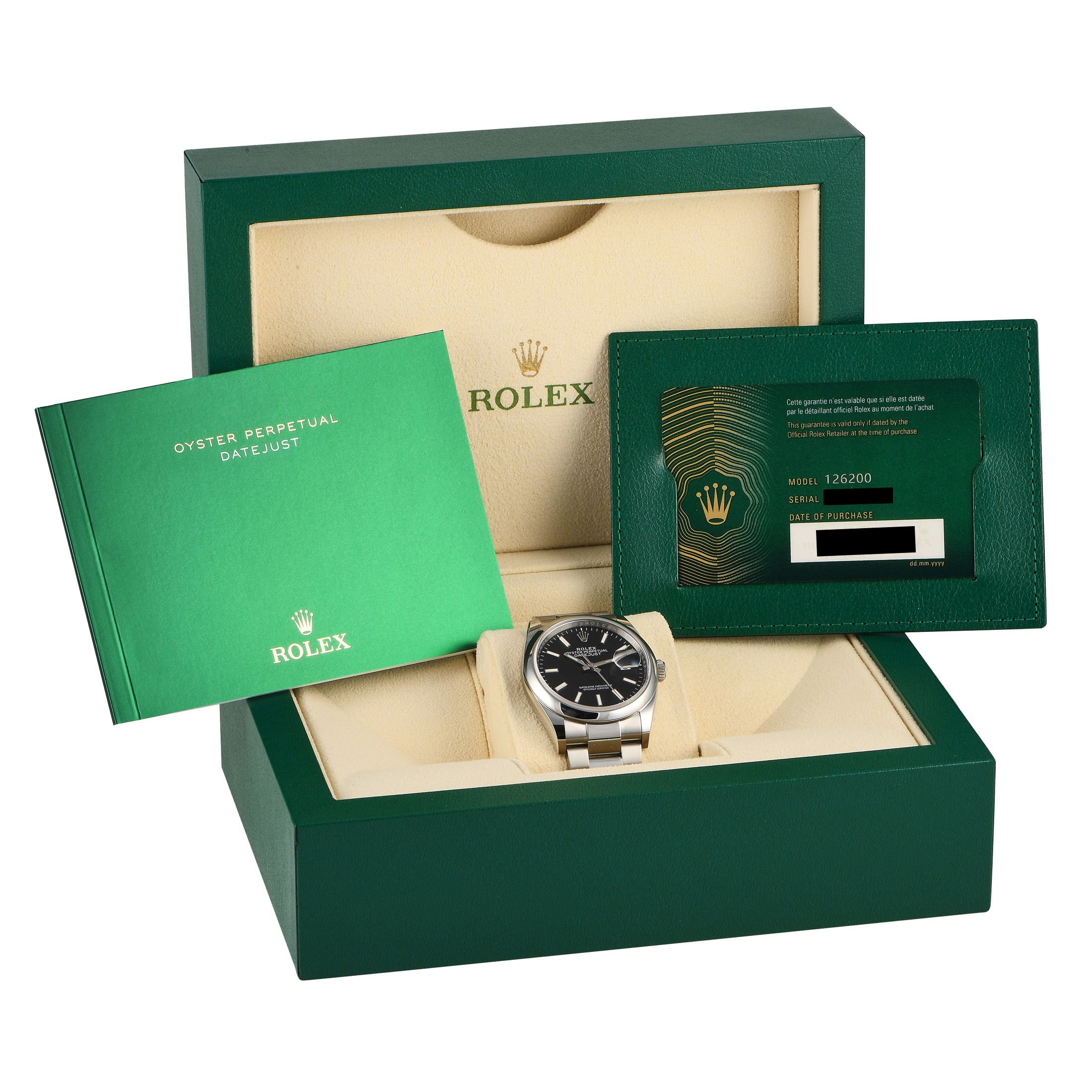 This unworn Rolex Datejust 36 Black Dial Steel Watch 126200 is accompanied by papers and the manufacturer’s box.