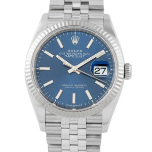 This is a pre-owned Rolex Datejust 36 Blue Dial White Rolesor 126234. It is accompanied by papers and the manufacturer’s box.
