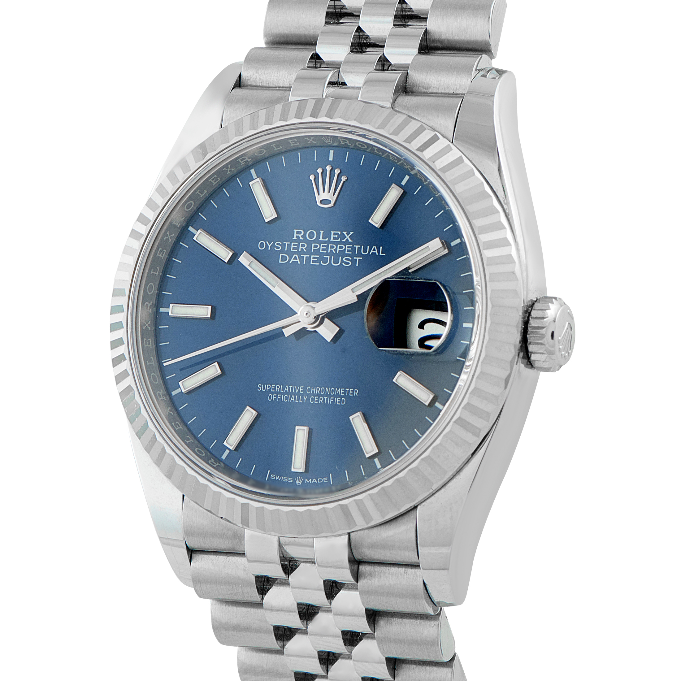 Presented in a versatile 36mm Oystersteel and white gold construction, this Datejust ref. 126234 perfectly balances everyday wearability and unmistakable luxury. Its fluted bezel immediately signals its Rolex heritage, while the elegant Jubilee bracelet delivers comfort and a distinctive, dressy aesthetic. The dynamic blue dial is detailed with Chromalight hour markers and hands, ensuring legibility. Its engine is the superb automatic Caliber 3235 that delivers precision timekeeping and the instantaneous jump date function.