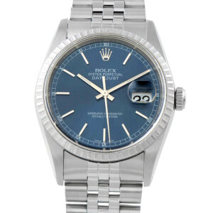 One of the last steel Datejusts to carry the engine-turned bezel, the 16220 closes a design path Rolex no longer revisits. Unlike the more common fluted bezel in white gold, this model features a finely engraved bezel in stainless steel. The 36mm case and Jubilee bracelet maintain a uniform tone throughout, while the blue dial introduces depth through its reactive surface. Inside, the automatic caliber 3135 delivers chronometer-rated reliability, a mainstay of Rolex production for decades.