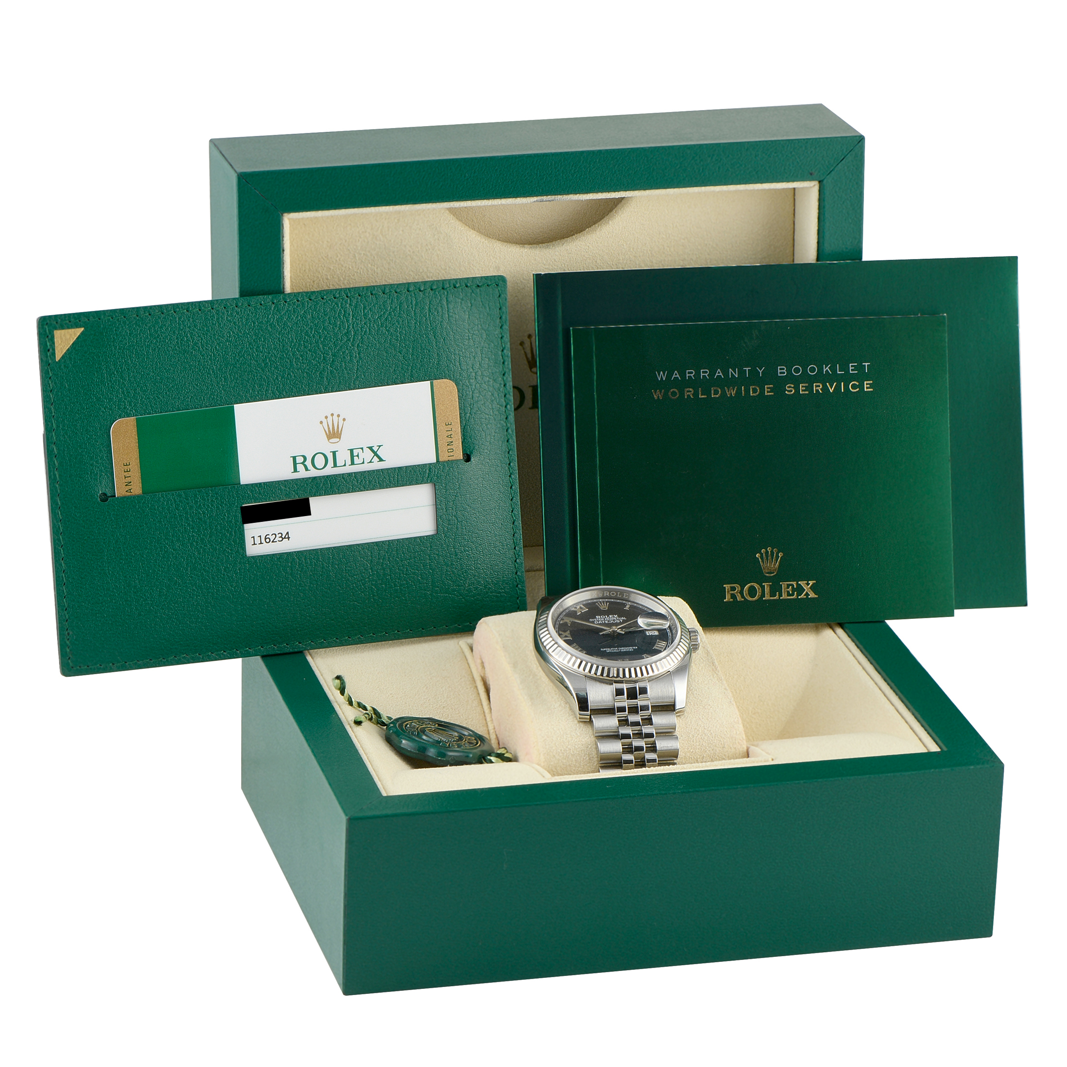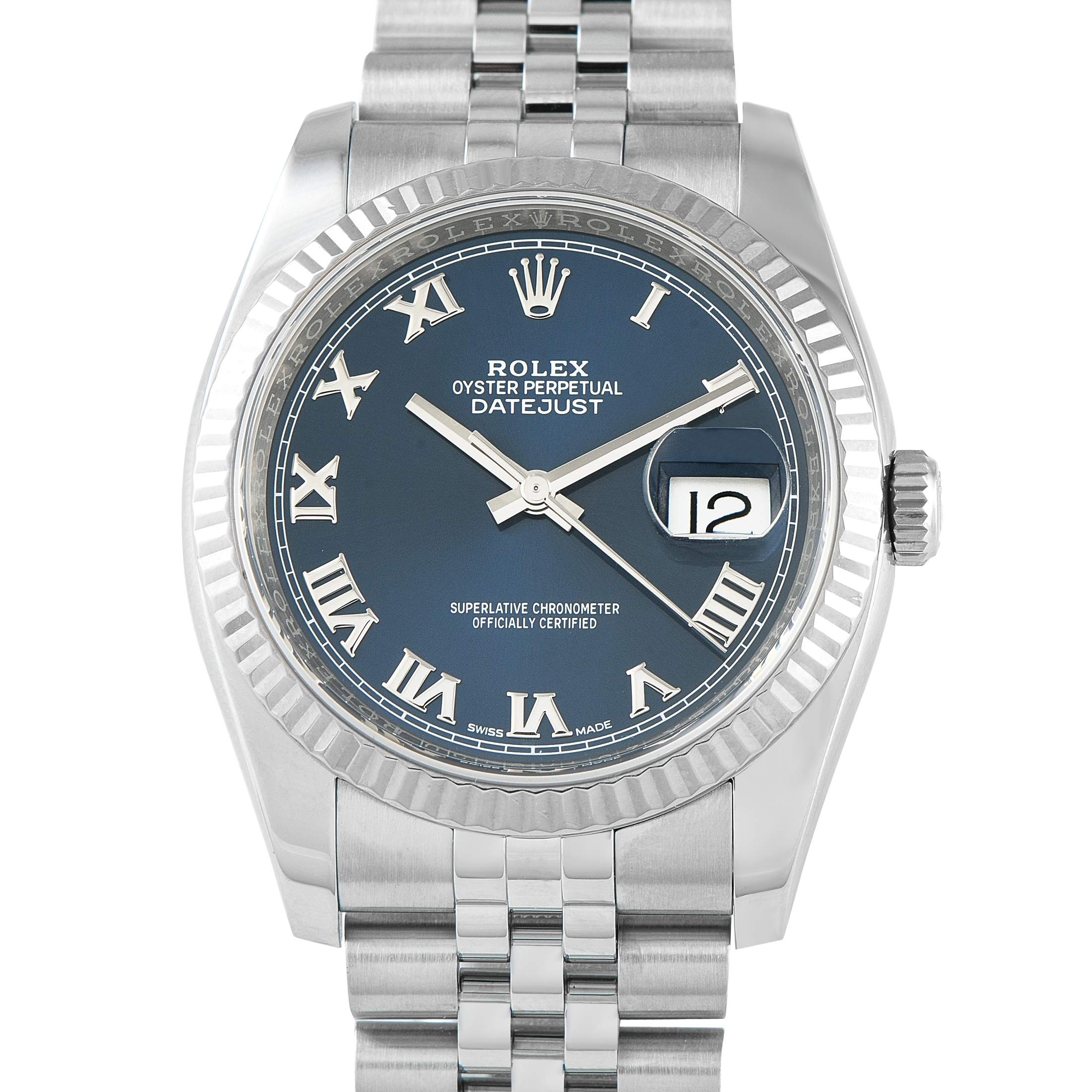 This pre-owned Rolex Datejust 36 Blue Roman Dial Watch 116234 is accompanied by the manufacturer’s box and papers.