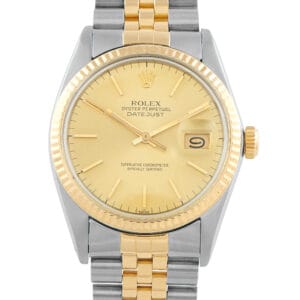 Offered pre-owned, this Rolex Datejust 36 Champagne Dial Jubilee Steel and 18K Yellow Gold Watch 16013 comes with a gift box.