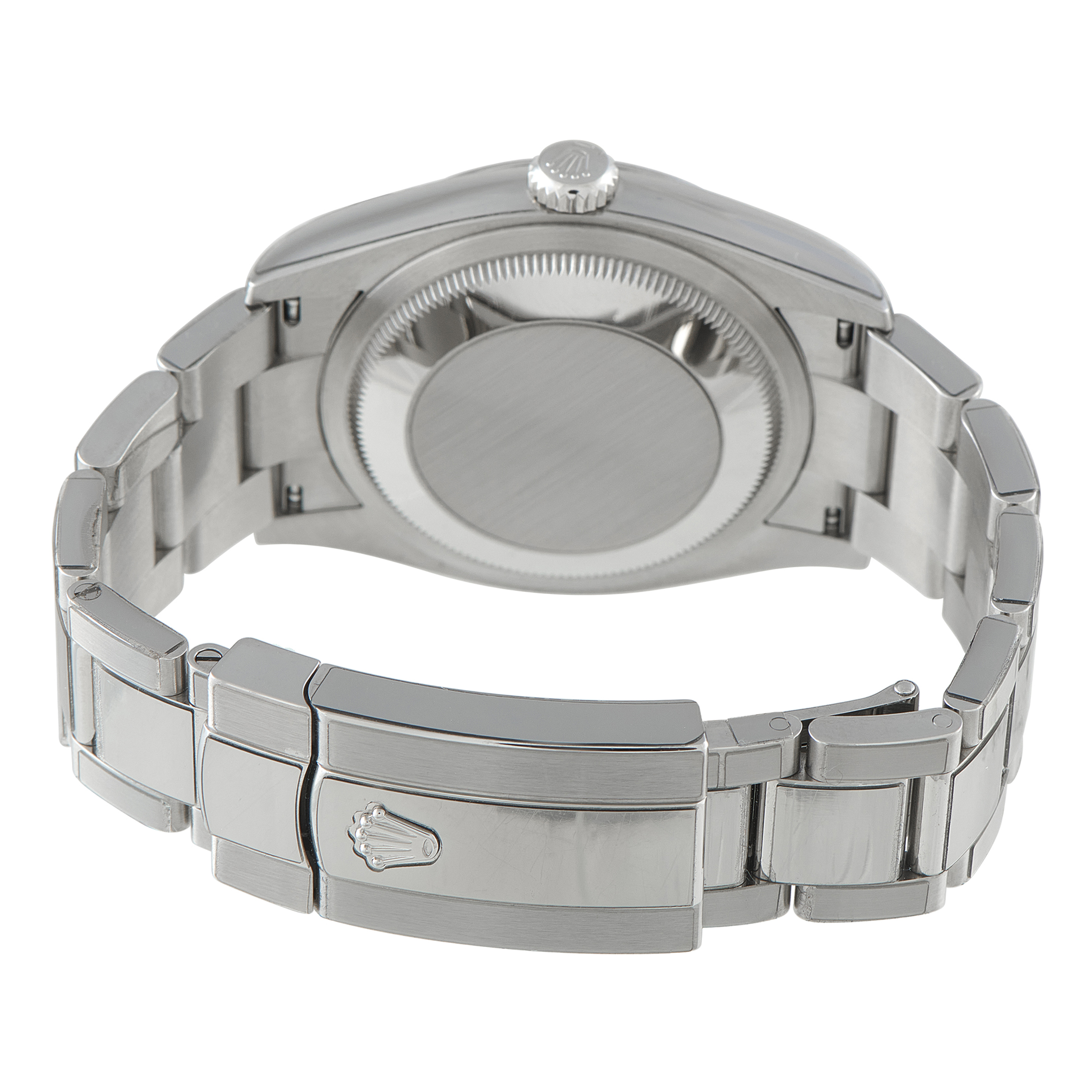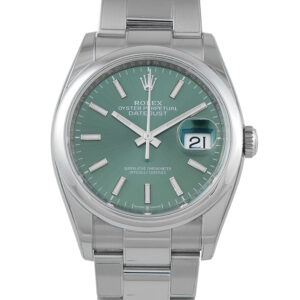 With its smooth bezel and straightforward layout, this reference emphasizes everyday versatility within the Datejust line. The mint green sunray dial softens the overall profile while maintaining clear legibility across the applied markers. Power is supplied by the automatic caliber 3235, a Superlative Chronometer certified movement with 70 hours of power reserve. The 36mm case and Oyster bracelet underline the watch’s focus on durability and daily versatility.
