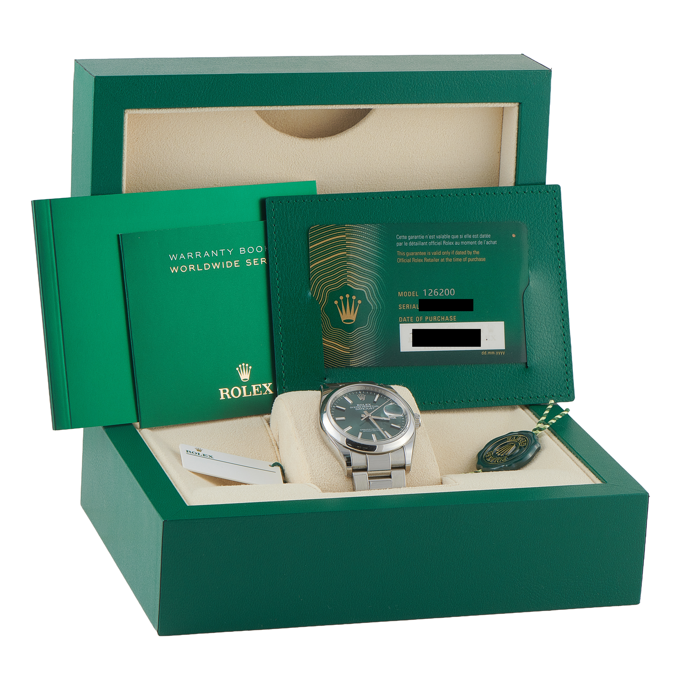 Offered pre-owned, this Rolex Datejust 36 Green Dial Oystersteel Watch 126200 comes complete with papers and the manufacturer’s box.