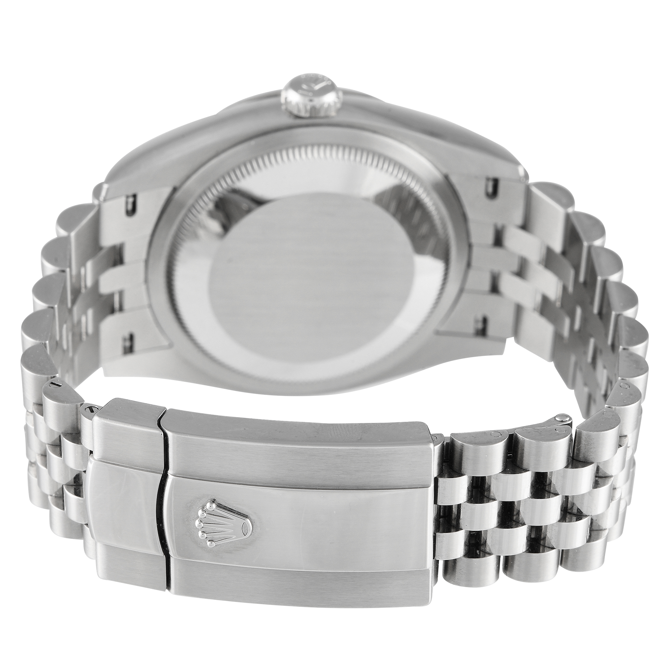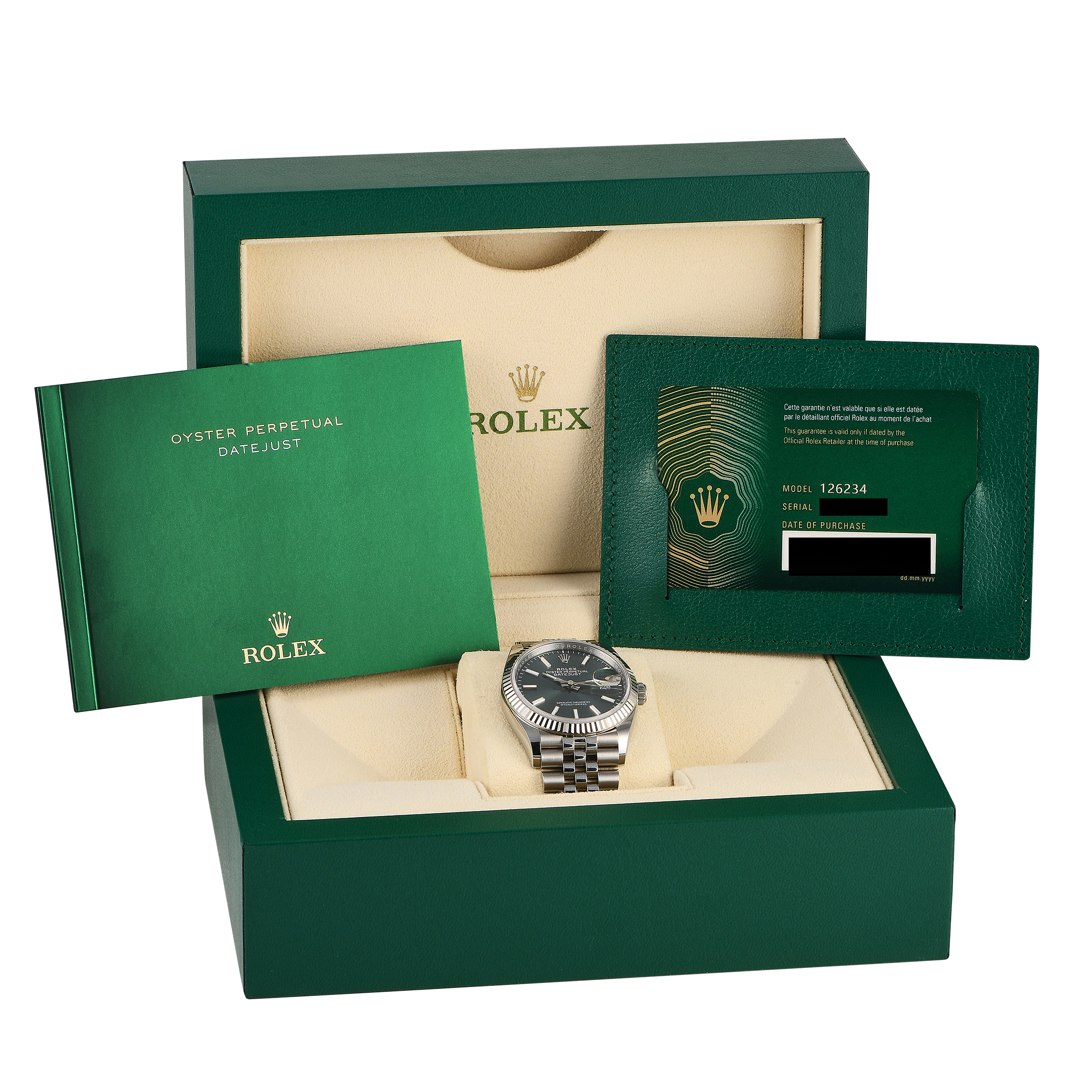 The Rolex ref.126234 is a green-dial Datejust released in 2022. This particular model features a mid-sized 36mm case in stainless steel, fitted with an 18K white gold fluted bezel. It bears a mint green dial with applied 18K white gold index hour markers filled with luminescent material. The hands are also in white gold, with luminescent hour and minute hands. The date window is at 3 o’clock, with a Cyclops lens. The watch is powered by the Superlative Chronometer certified Rolex in-house caliber 3235 automatic movement with a 70-hour power reserve. This timepiece is supplied with a Rolex Jubilee bracelet.