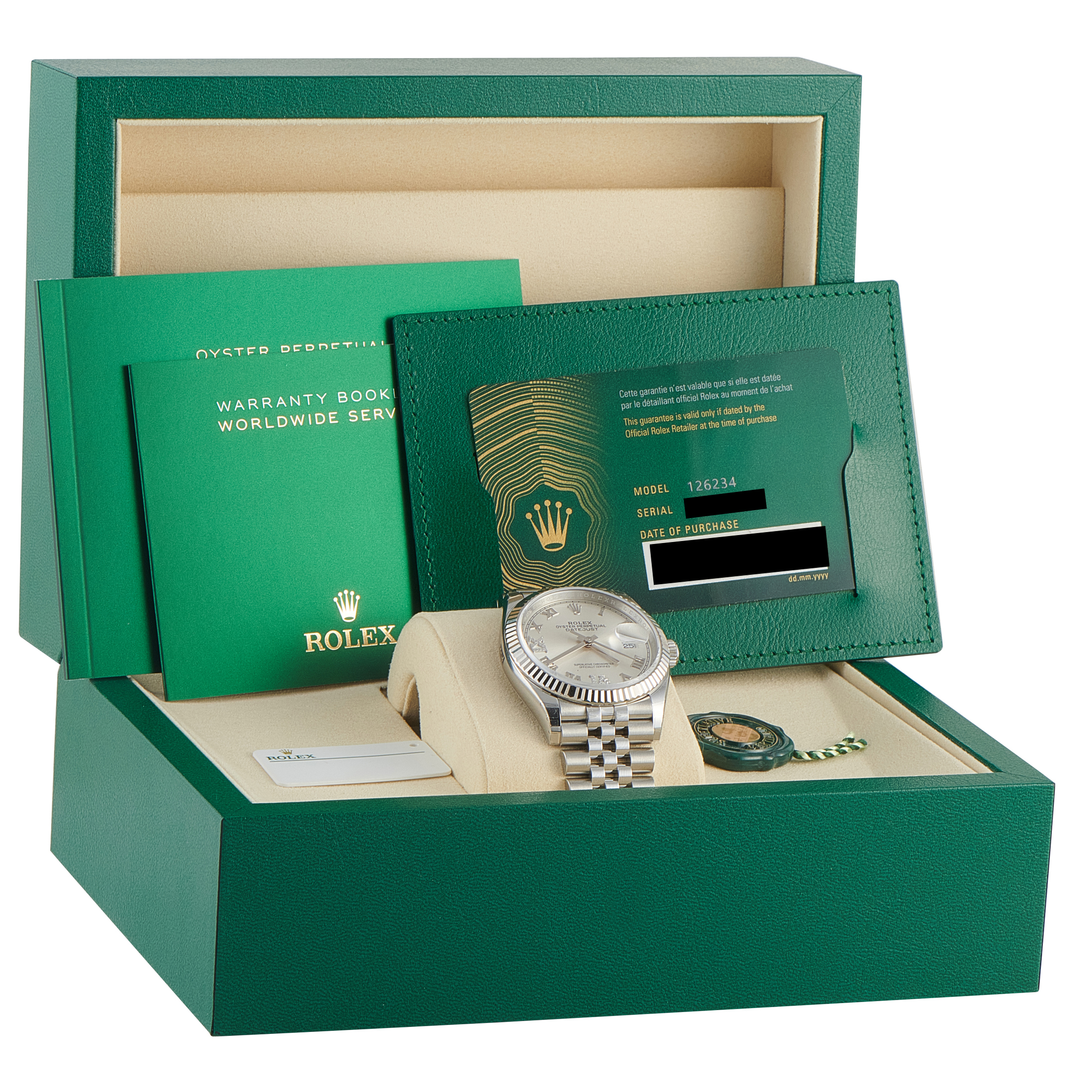 Presented as a complete set, this unworn Rolex Datejust 36 Silver Roman Diamond Dial White Rolesor Jubilee Watch 126234-0029 includes its original manufacturer’s box and papers.