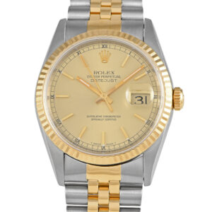 This opulent timepiece features a 36mm Stainless Steel case, a fluted 18K Yellow Gold bezel, and a two-toned bracelet that combines Stainless Steel with 18K Yellow Gold. The champagne dial includes gold toned hands, gold toned index markers accented by Roman numeral hour markers, and a date dial located at the 3-o-clock position. It’s powered by an automatic Rolex calibre 3135 movement and is water resistant up to 100 meters.