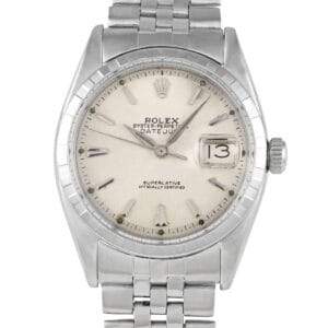 This impeccably crafted vintage timepiece features a 36mm case, bezel, and bracelet crafted from stainless steel. On the repainted ivory dial, you’ll find silver toned hands, silver toned index markers, and a magnified date dial located at the 3-o-clock position.