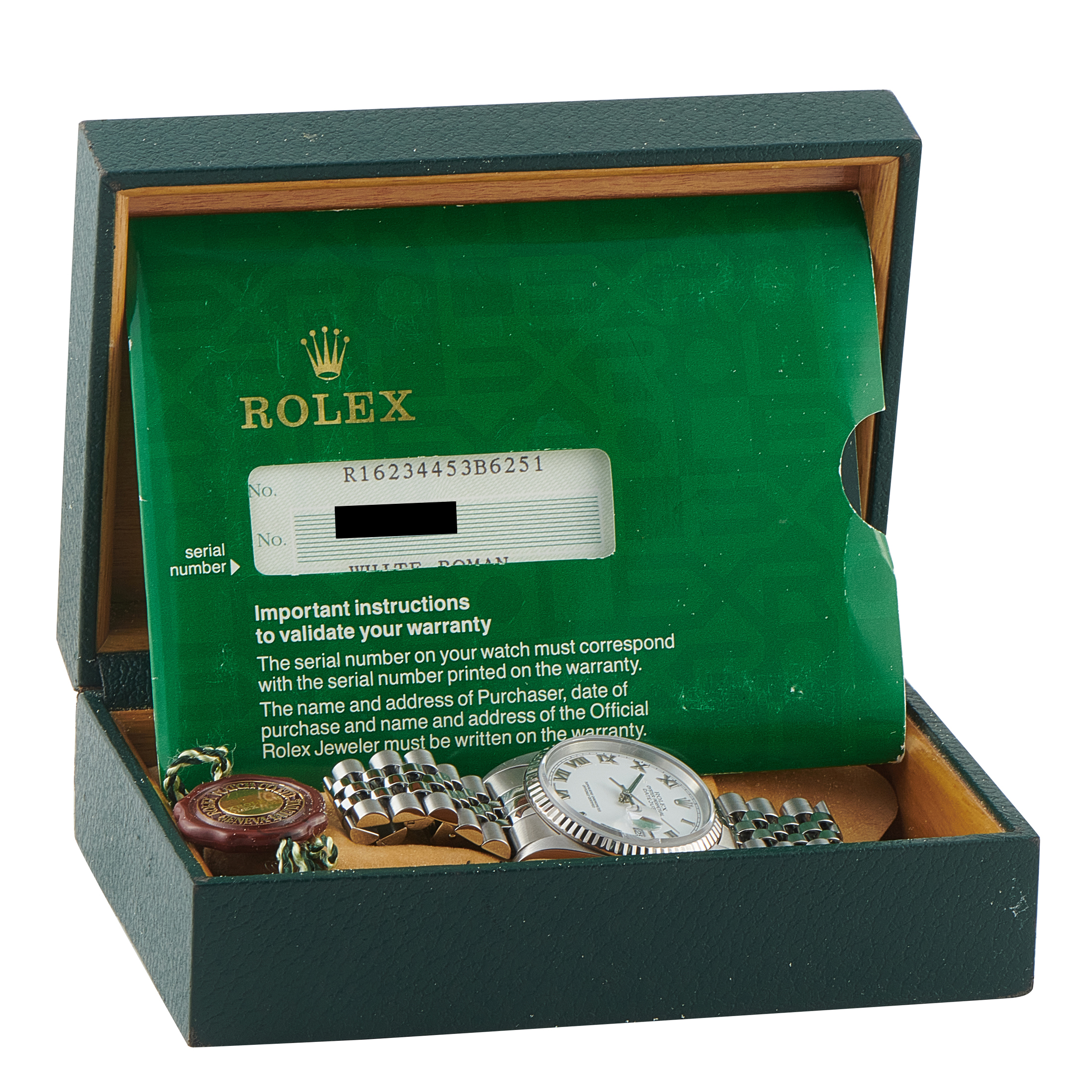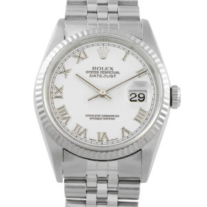 Offered pre-owned, this Rolex Datejust 36 White Roman Dial White Rolesor Jubilee Watch 16234 includes papers and the manufacturer’s box.