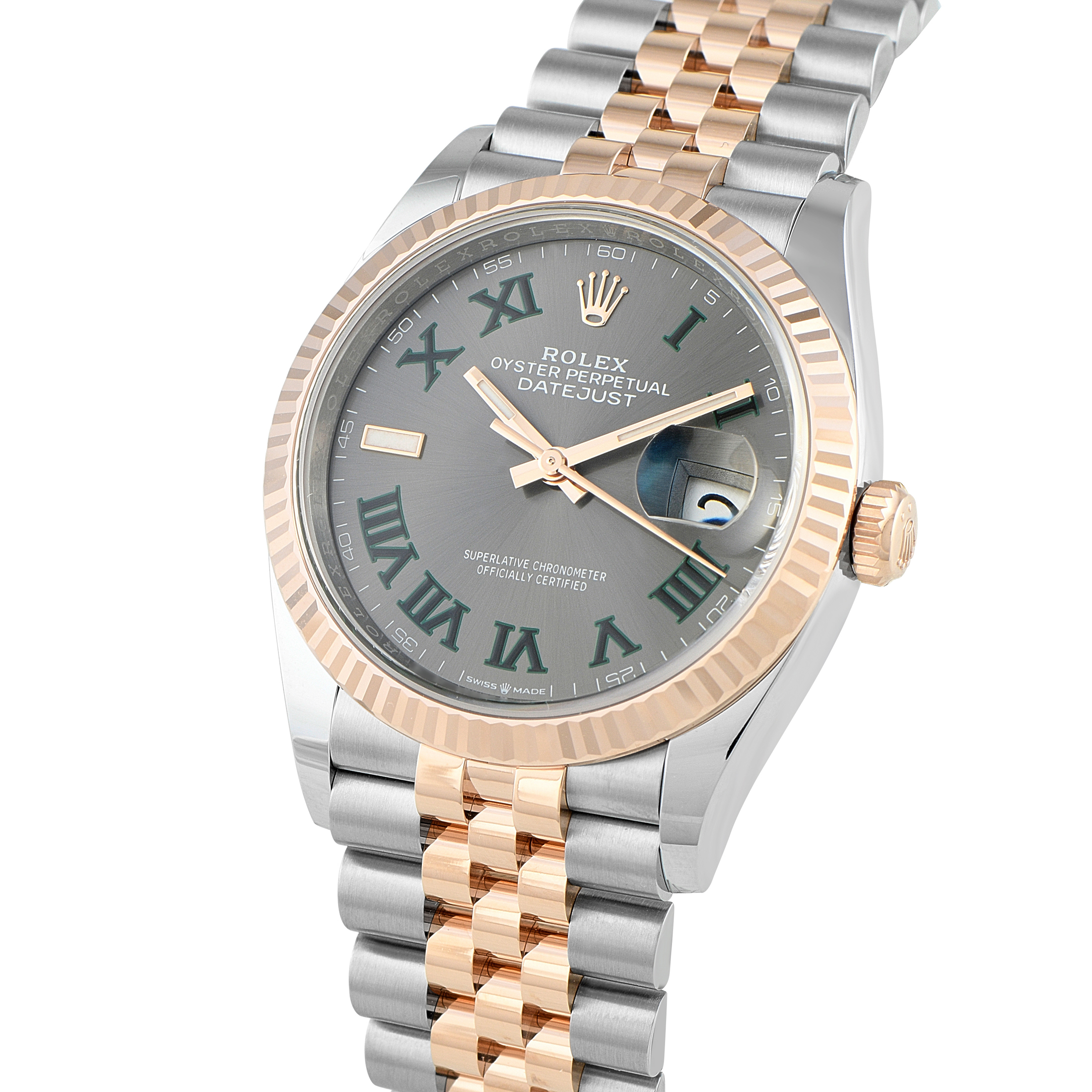An example of two-toned luxury, the Rolex Datejust 36 ref. 126231 is crafted in a blend of hardwearing Oystersteel and warm Everose gold. Its 36mm case is paired with a fluted bezel in rose gold, and worn on a Jubilee bracelet that delivers a fluid drape on the wrist. Adding depth to the watch is a sunray-finished slate dial with green-trimmed Roman numeral hour markers. The watch’s heart is the reliable caliber 3235 self-winding movement with a long power reserve of 70 hours.