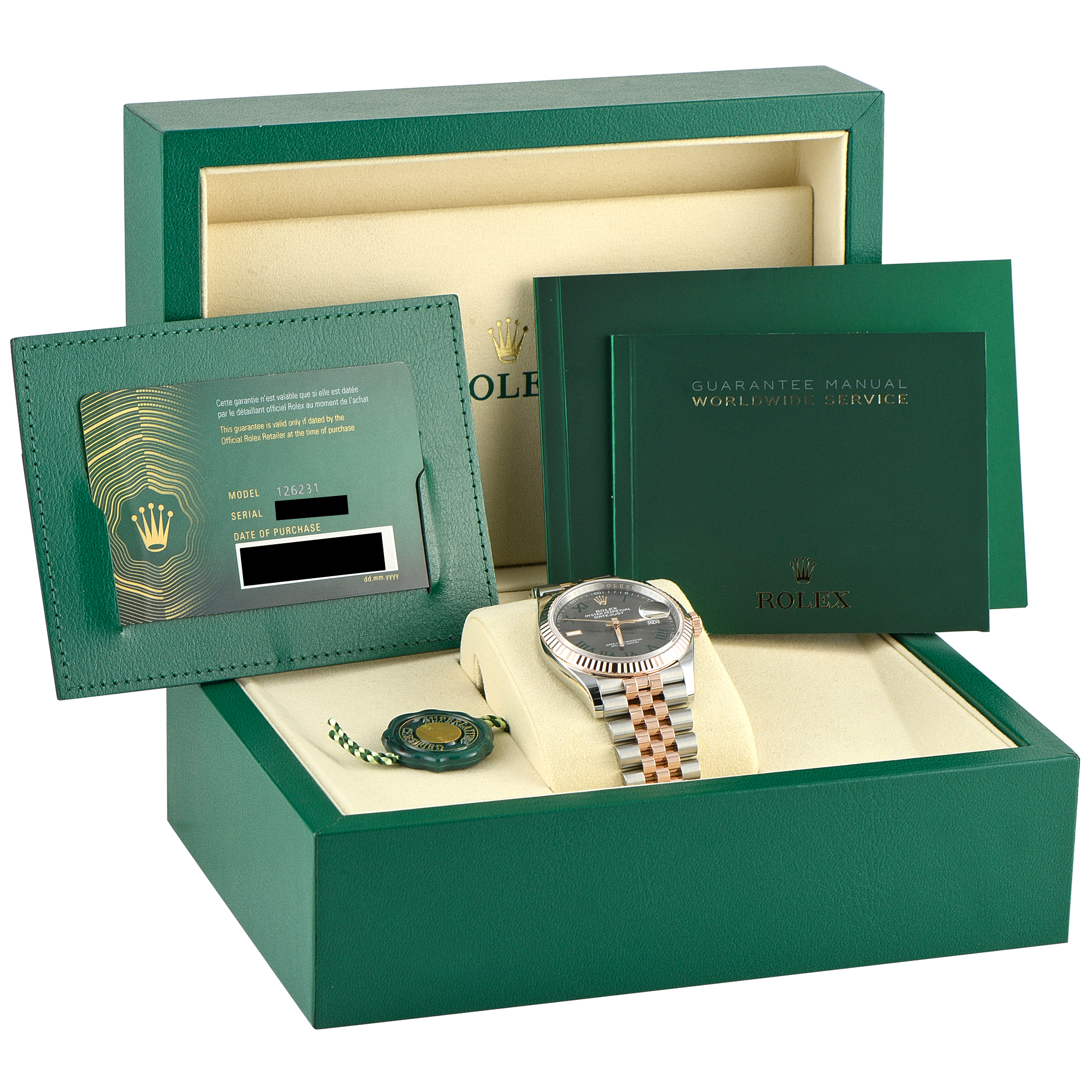 This is an unworn Rolex Datejust 36 Oystersteel and Everose Gold Watch 126231. It comes complete with papers and the manufacturer’s box.
