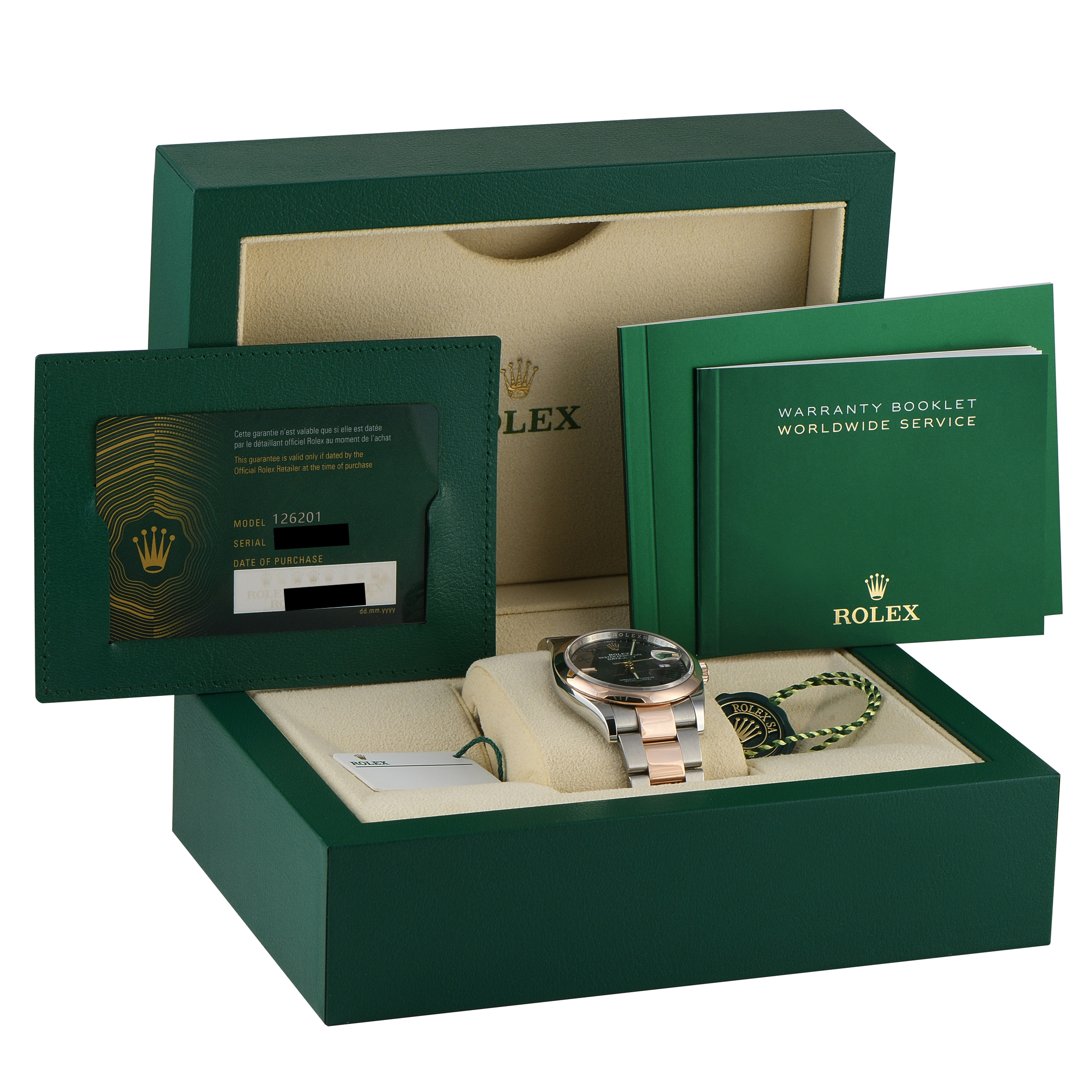 This Rolex Datejust 36 ref.126201 is a fusion of classic elegance and technical precision. Its 36mm steel case is paired with a smooth 18K Everose gold bezel. The crown and the center links of the bracelet are also made of Rolex’s proprietary pink gold alloy. This timepiece features a slate gray Wimbledon dial featuring bold Roman numeral hour markers outlined in green. The hands are in Everose gold, matching the luminous index marker at 9 o’clock. A date window is positioned at the 3 o’clock position, featuring a Cyclops lens for optimal legibility. Powering the watch is the self-winding Caliber 3235—Superlative Chronometer-certified for exceptional accuracy and performance.