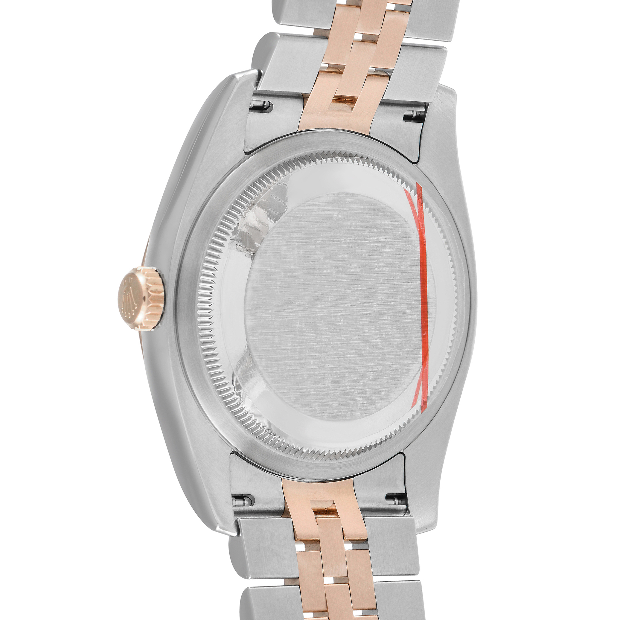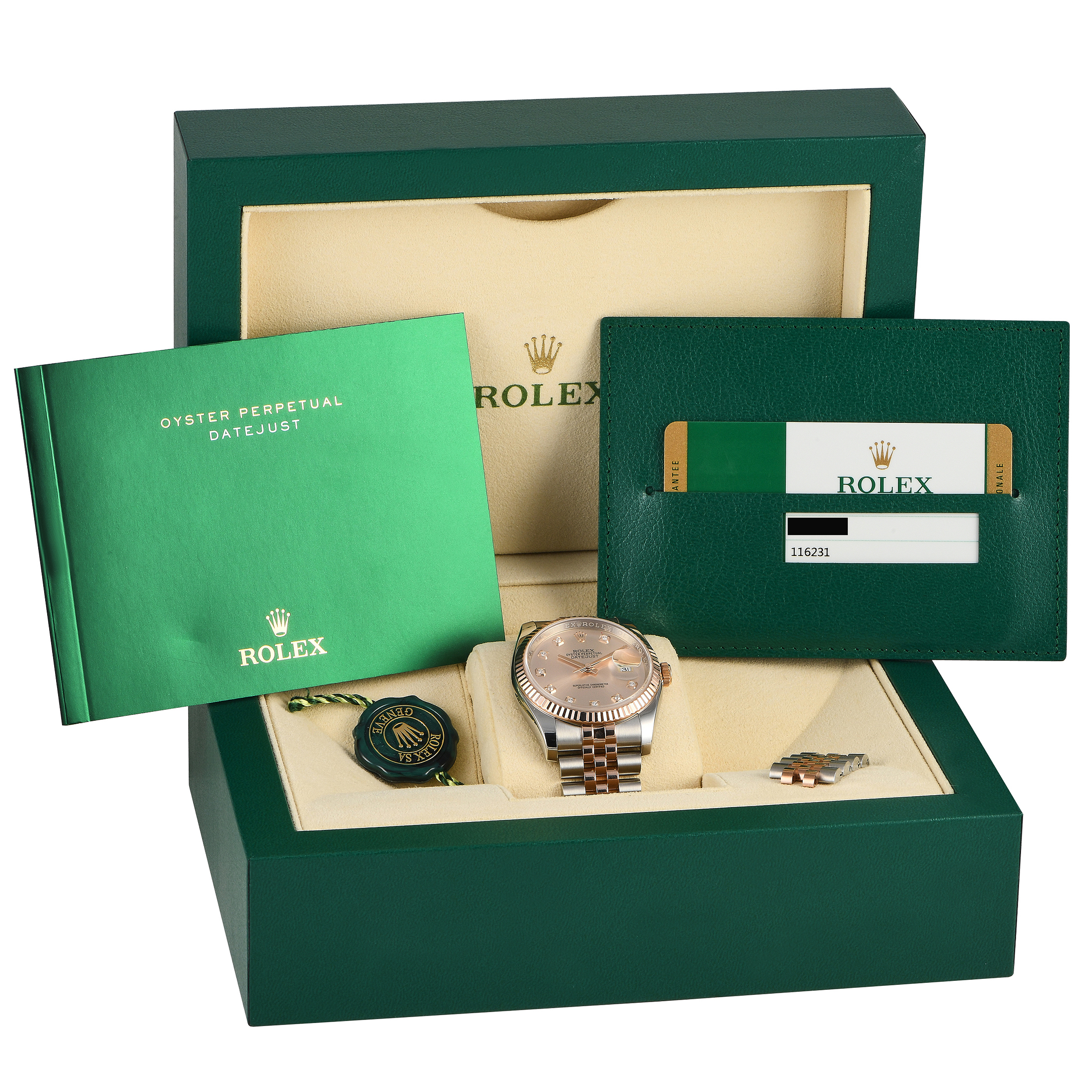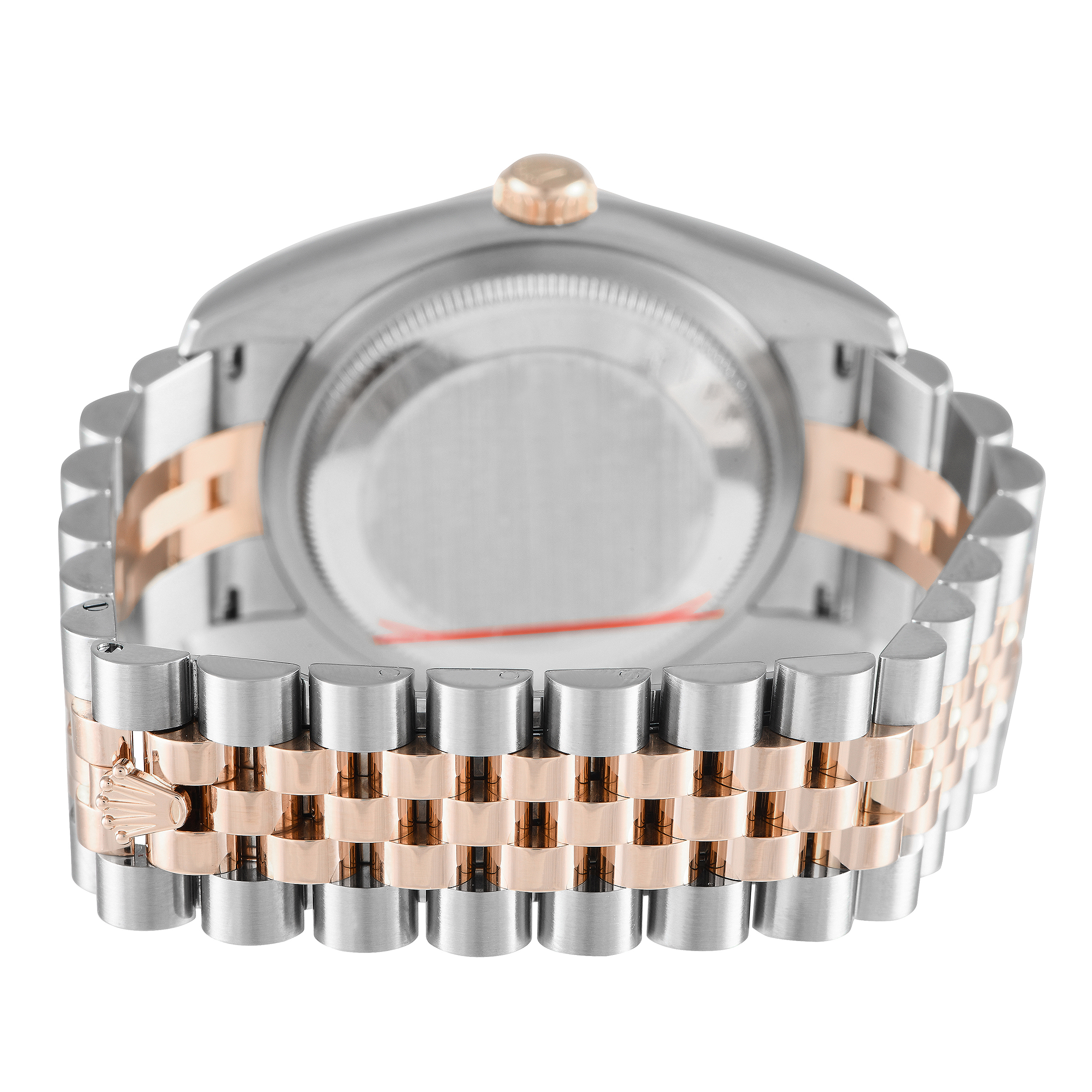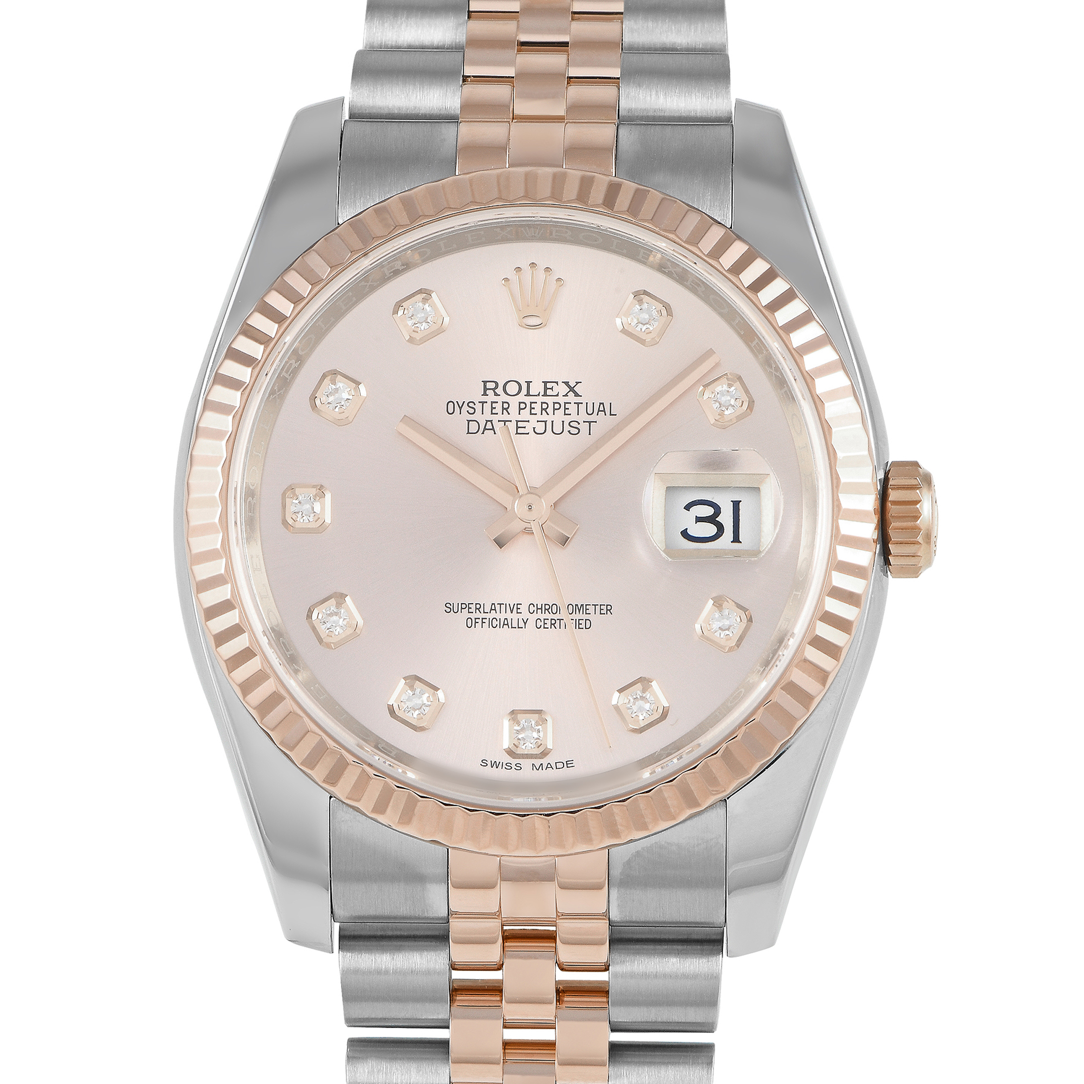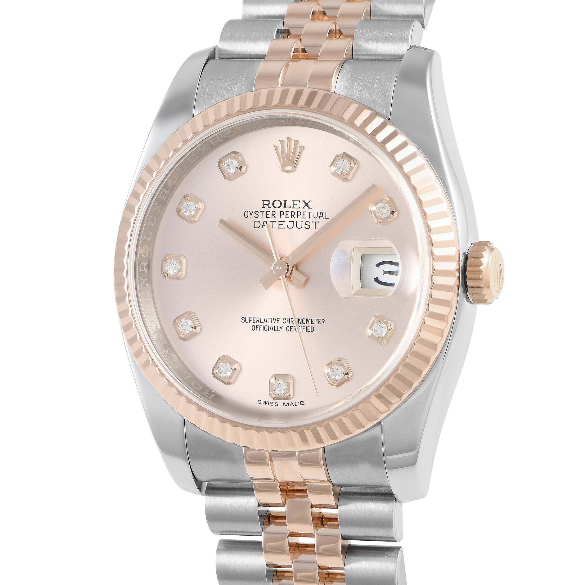 This impeccable timepiece features a 36mm Stainless Steel case, a fluted 18K Rose Gold bezel, and a Jubilee bracelet crafted from a combination of Stainless Steel and 18K Rose Gold. The shimmering pink dial includes rose gold toned hands, a date dial located at the 3-o-clock position, and shimmering Diamond hour markers. It’s powered by an automatic Rolex calibre 3135 movement with approximately 70 hours of power reserve.