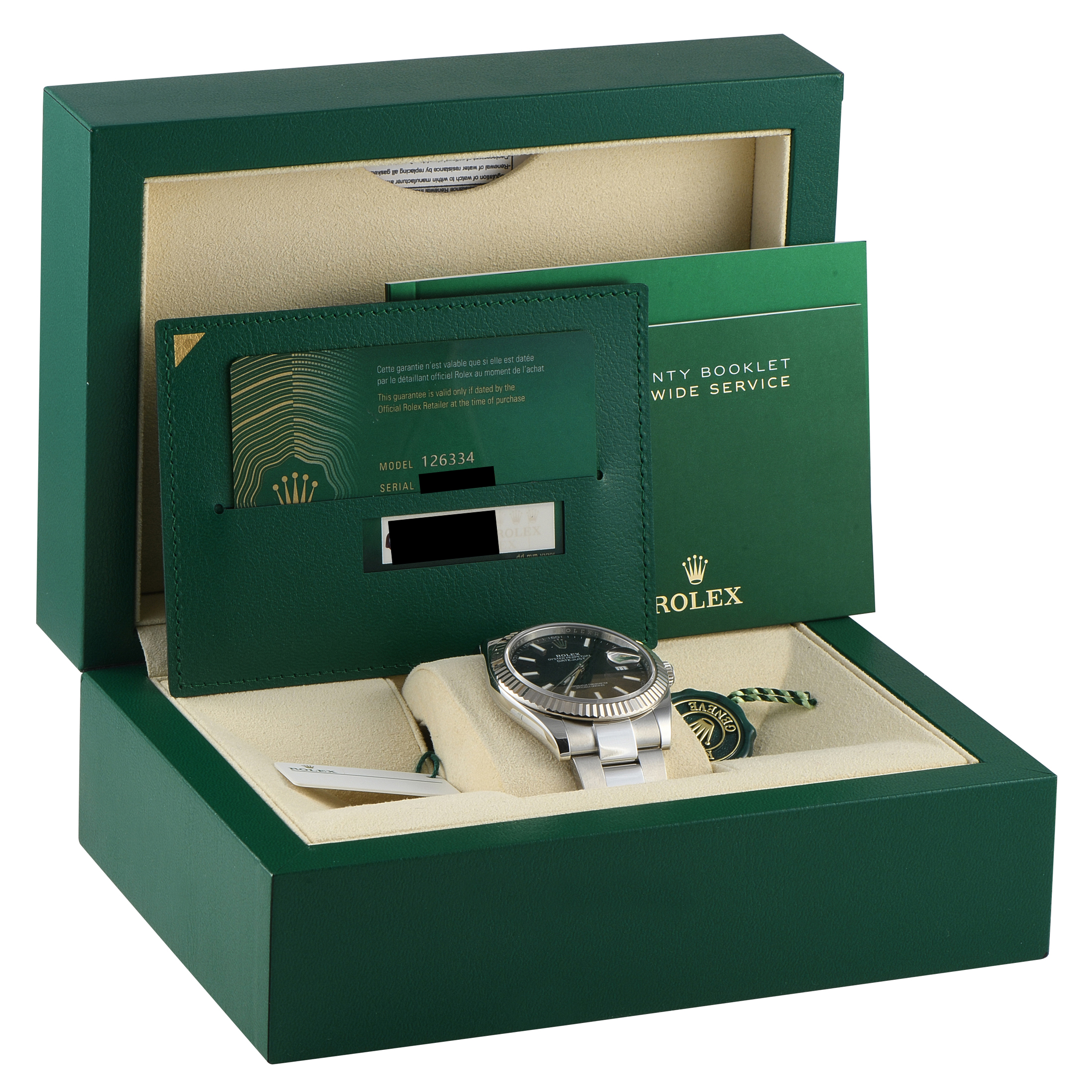 This pre-owned Rolex Datejust 41 Black Dial Watch 126334 comes with papers and the manufacturer’s box.
